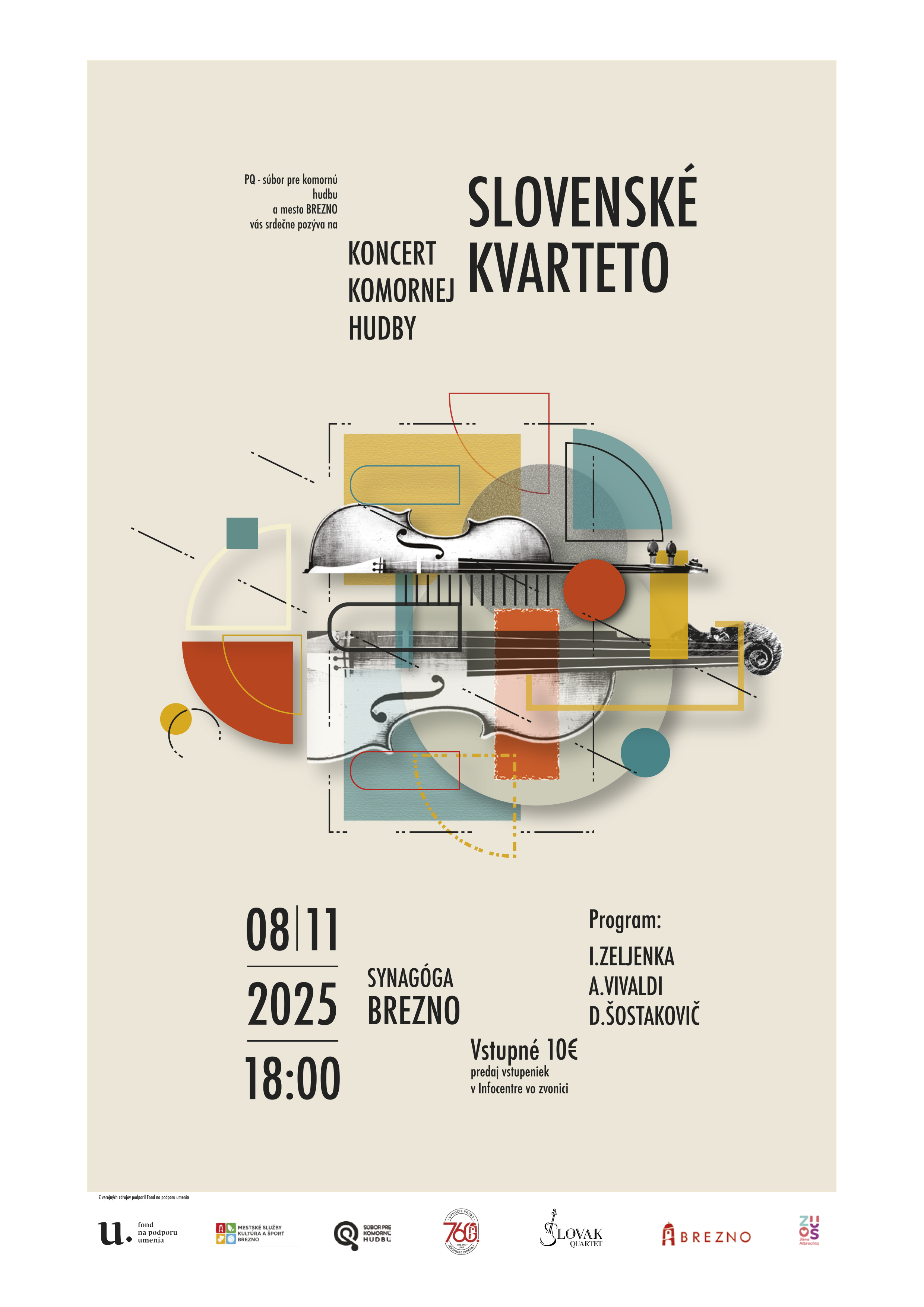 Koncert Slovenského kvarteta 08.11.2025 o18:00, Synagóga Brezno Lukáš Szentkereszty. Eduard Pingitzer, Martin Mierny a Martin Ťažký Vám v rámci cyklu Komorné stretnutia so Šostakovičom zahrajú I. Zeljenku, A. Vivaldiho a D. Šostakoviča