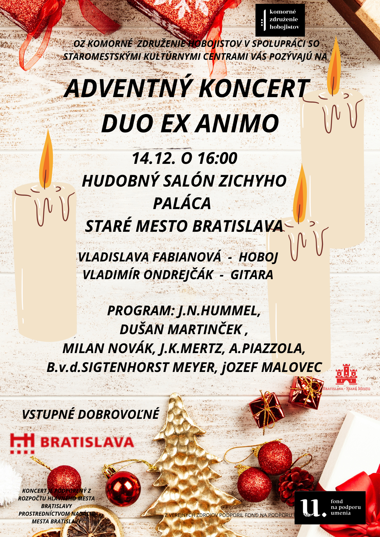 Komorný koncert - Duo Ex Animo 14.12. 2025 o 16:00 v Hudobnom salóne Zichyho paláca Program: D. Martinček, J. Malovec, M. Novák, B. v.d. Sigtenhorst Meyer, J. K. Mertz, A. Piazzola, J. N. Hummel