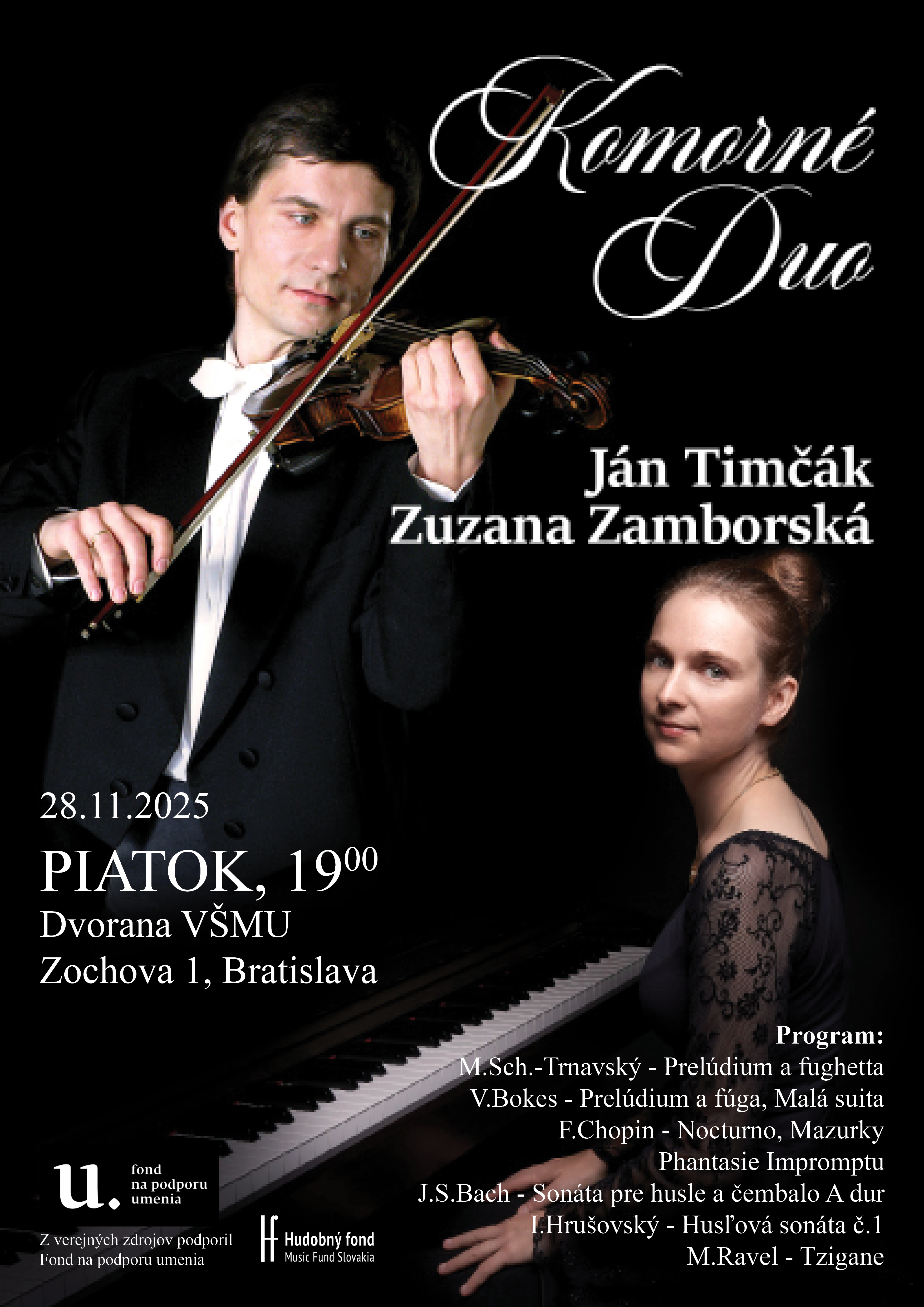 Johann Sebastian Bach (1685 - 1750) - Sonáta pre husle a čembalo A dur BWV 1015 1. Dolce 2. Allegro assai 3. Andante un poco 4. Presto Peter Machajdík (1961) - Udržateľná všímavosť Ivan Hrušovský (1927 - 2001) - Sonáta pre husle a klavír č.1 Ľudovít Rajter (1906 - 2000) - Tri slovenské tance Eugen Suchoň (1908 - 1993) - Poème macabre op.17 Maurice Ravel (1875 - 1937) - Tzigane