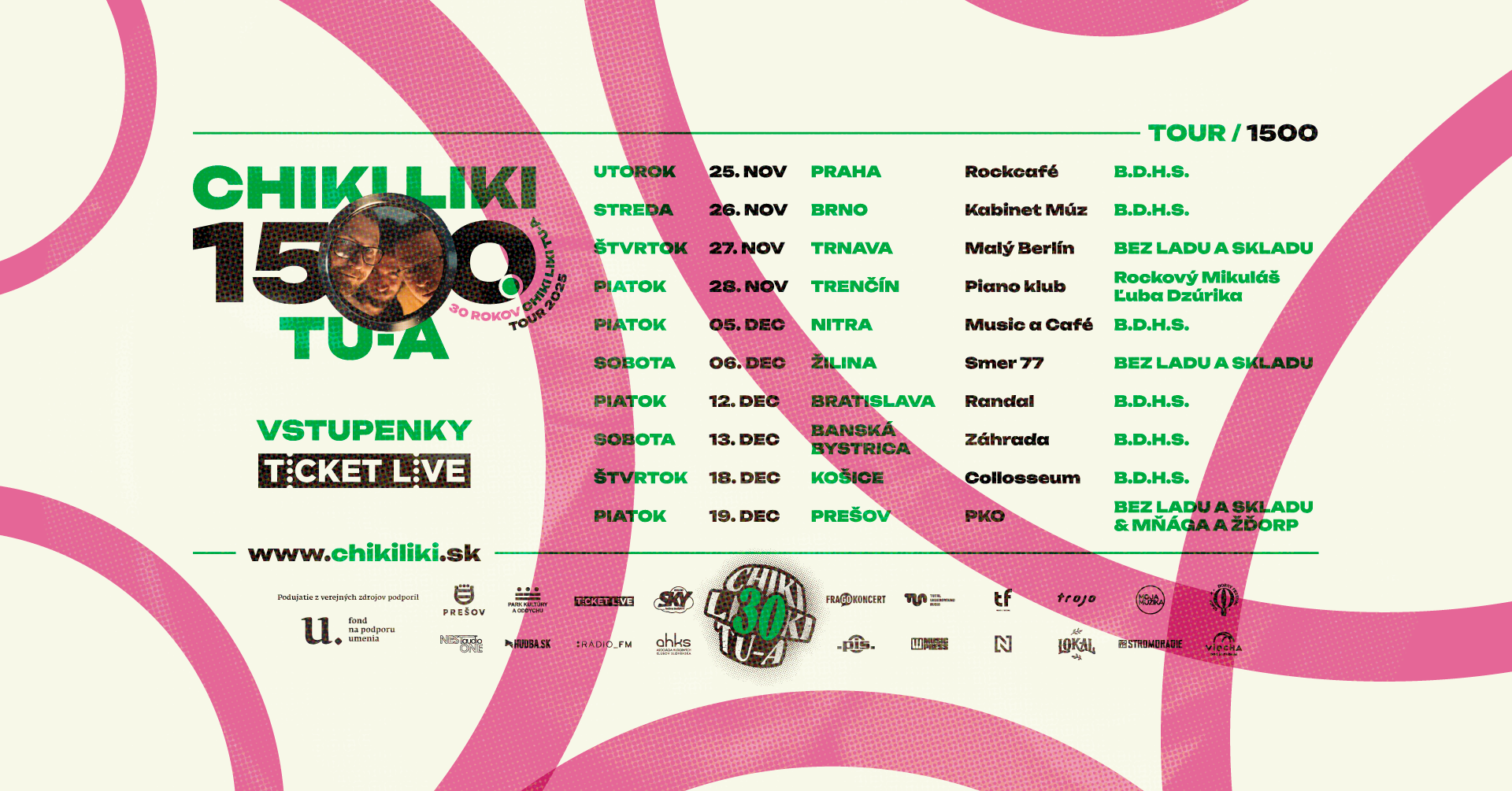 CHIKI LIKI TU-A koncert číslo 1500 !!! TOUR 2025 !!! prešovská alternatívna skupina CHIKI LIKI TU-A oslavuje 30 rokov svojej existencie. Tohto roku dosiahne ďalší míľnik svojej kariéry, a to 1500 odohraných koncertov. Stane sa tak presne v piatok 19. decembra 2025 v prešovskom PKO - Čierny Orol. Hostia koncertu BEZ LADU A SKLADU & MŃÁGA A ŽĎORP