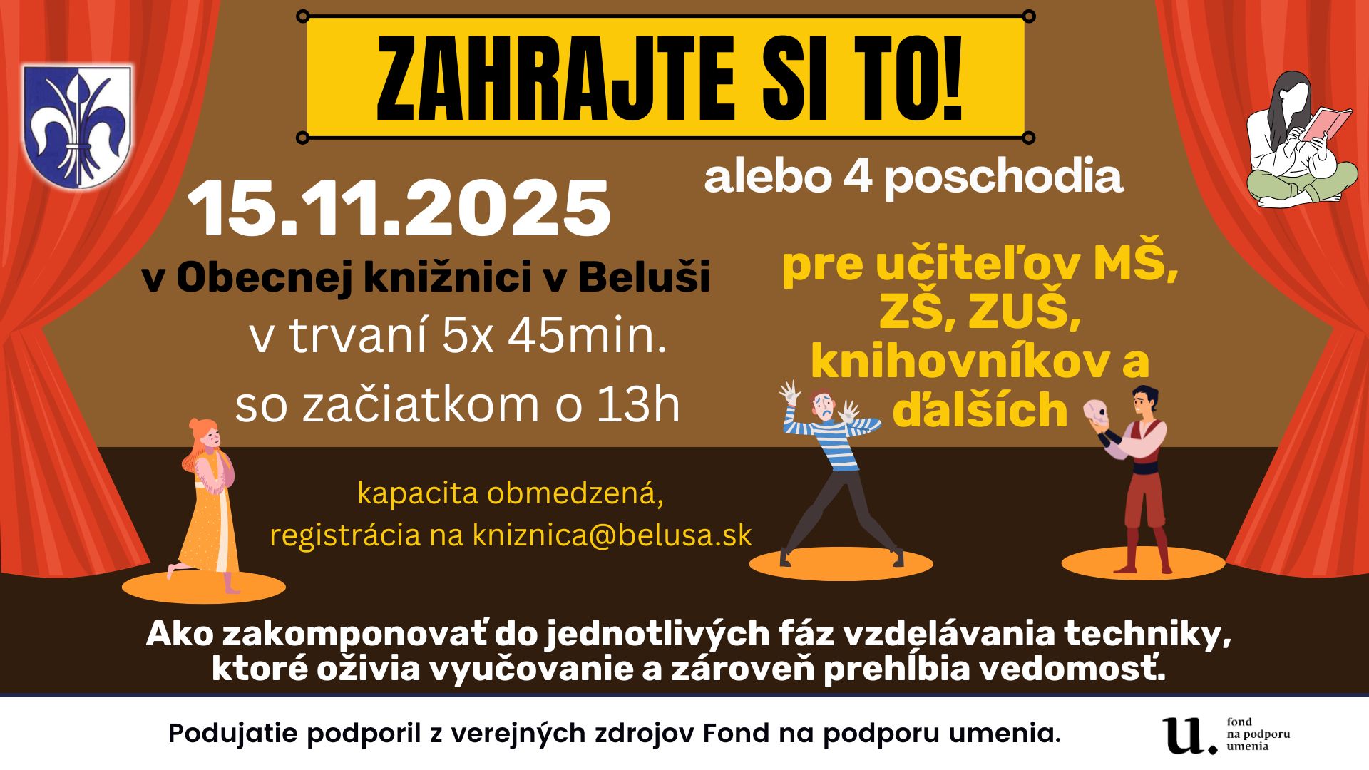 Obecná knižnica v Beluši prináša laickej a odbornej verejnosti okrem kultúrnych aj vzdelávacie podujatia. V novembri predstavia aplikáciu metód dramatickej východy do vyučovania lektori Edudramy, aby pomohli oživiť vyučovanie profesionálom pracujúcim s deťmi a mládežou. Prihlásiť sa treba osobne v knižnici alebo na kniznica@belusa.sk.