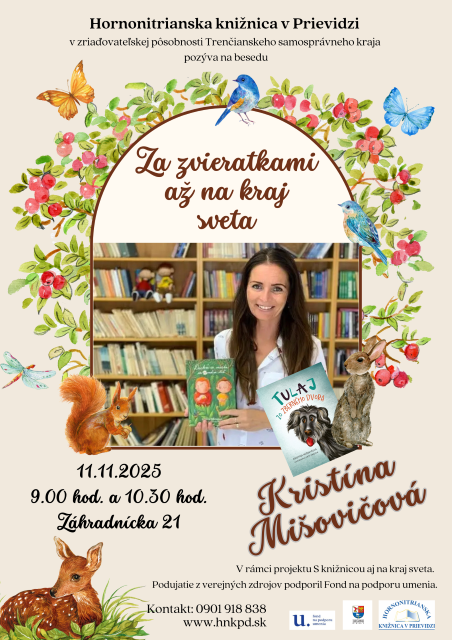 V mesiaci november privítame v Hornonitrianskej knižnici v Prievidzi spisovateľku Kristínu Mišovičovú, ktorá si pre žiakov základnej školy pripravila zaujímavú besedu. V utorok 11.11.2025 vezme deti na pomyselný výlet do sveta zvierat.