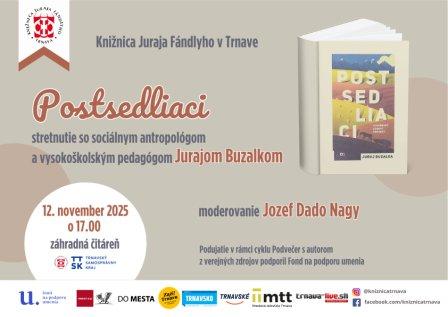 V knižnici privítame sociálneho antropológa a vysokoškolského pedagóga Juraja Buzalku. Pôsobí na UK v Bratislave, kde sa venuje politickej a ekonomickej antropológii, skúma sociálne hnutia a transformácie, nacionalizmus a populizmus. V roku 2023 mu vyšla kniha Postsedliaci: Slovenský ľudový protest, kde sa nemilosrdne pozerá na Slovákov, komentuje naše ilúzie o sebe i naše utkvelé predstavy o fungovaní sveta. Moderuje Jozef Dado Nagy.