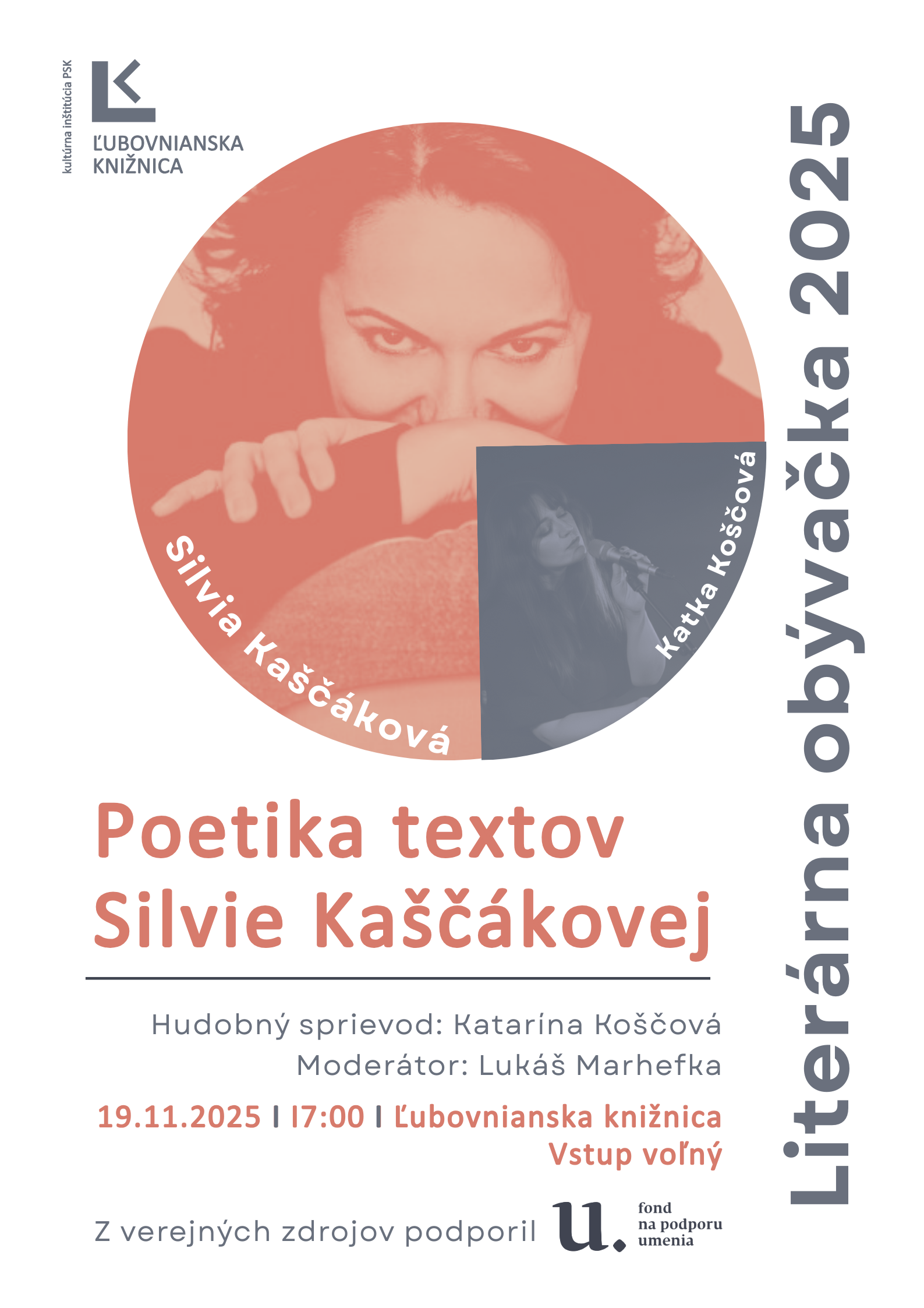 Pozvanie do Literárnej obývačky prijala poetka, prekladateľka a vysokoškolská pedagogička Silvia Kaščáková, autorka oceňovaných básnických zbierok a autorka piesňových textov. O jej zážitkoch s písaním textov sa bude zhovárať moderátor Lukáš Marhefka a atmosféru tohto výnimočného podujatia umocní spev Katky Koščovej, ktorej Silvia venovala niekoľko svojich textov. Pozývame všetkých v tento jesenný podvečer na príjemnú oslavu poetického slova a lahodných hudobných tónov.