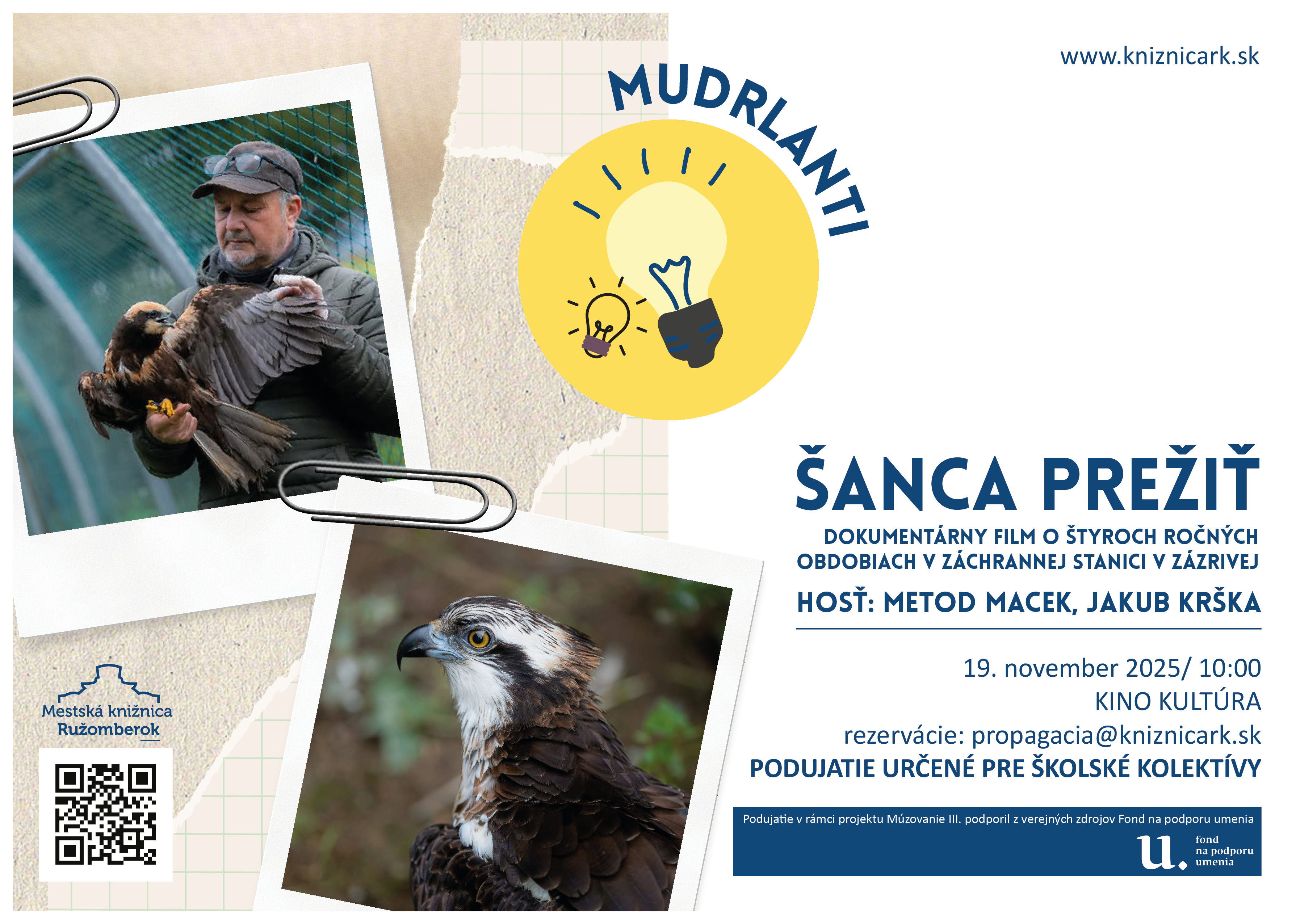 Premietanie dokumentárneho filmu Šanca prežiť, ktorý zachytáva najsilnejšie príbehy zo Záchrannej stanice pre zranené živočíchy v Zázrivej. Stretnutie so strážcom Štátnej ochrany prírody v Národnom parku Veľká Fatra Metodom Mackom a fotografom Jakubom Krškom.