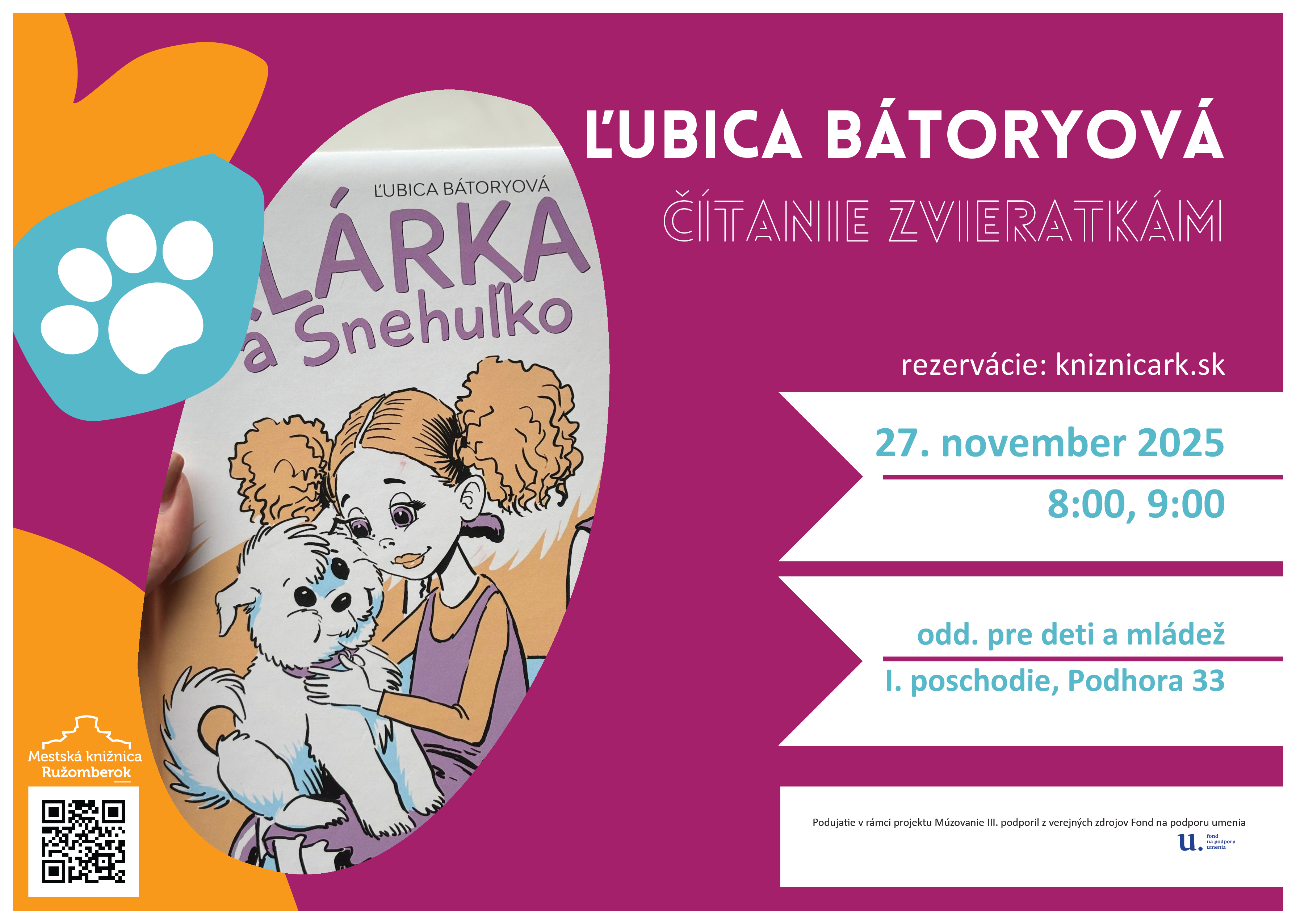 ČÍTANIE ZVIERATKÁM. Stretnutie s Ľubicou Bátoryovou, canisterapeutkou, kynologičkou, záchranárkou a obľúbenou autorkou kníh pre deti, ktorá je medzi nimi známa ako "teta so psíkmi".