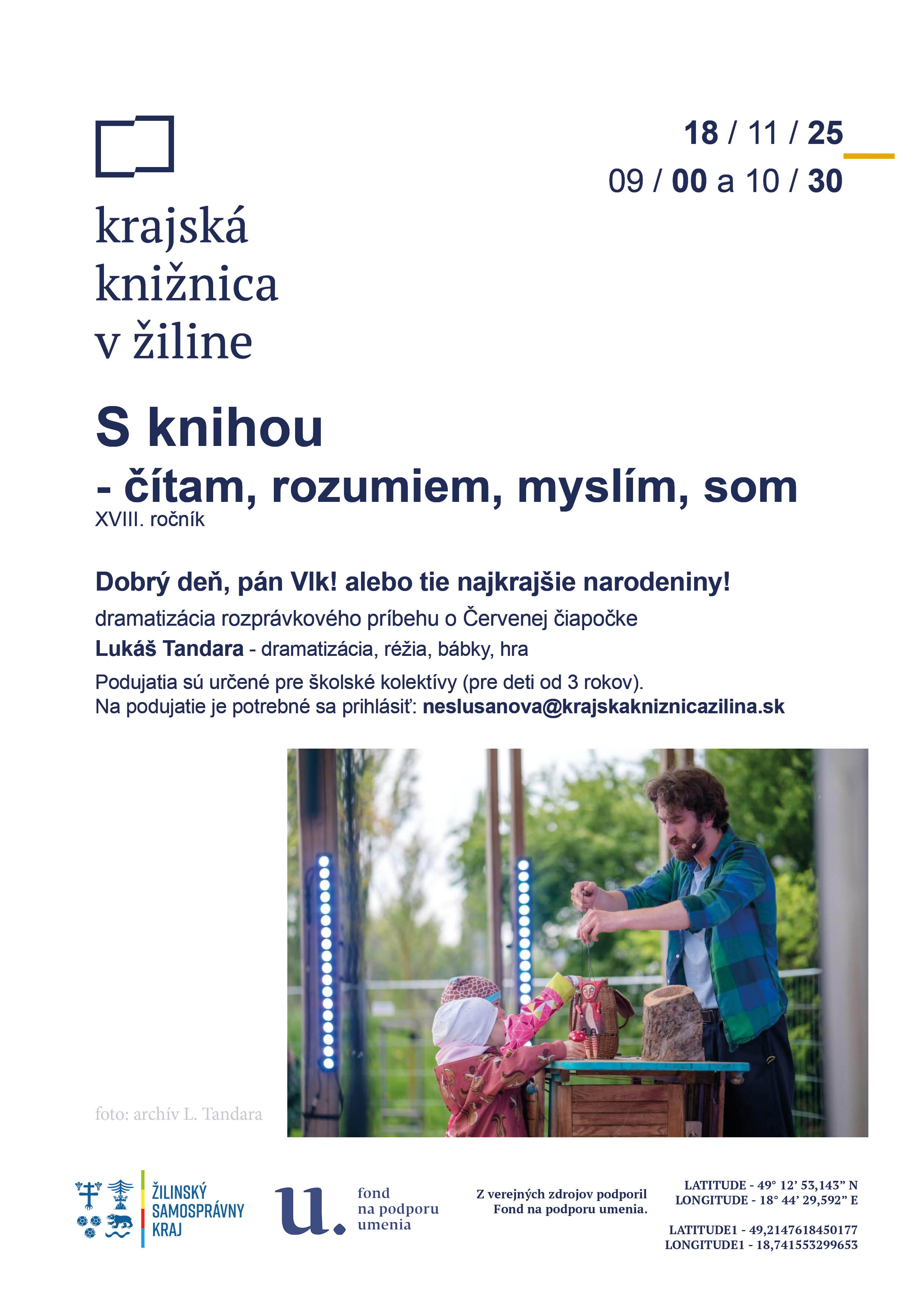 Hornonitrianska knižnica v Prievidzi prináša kúsok divadelného sveta priamo do Spojenej školy internátnej v Prievidzi. Podujatie sa uskutoční priamo v priestoroch školy, aby si deti so špeciálnymi potrebami mohli vychutnať zážitok z divadla v prostredí, ktoré poznajú a v ktorom sa cítia bezpečne.