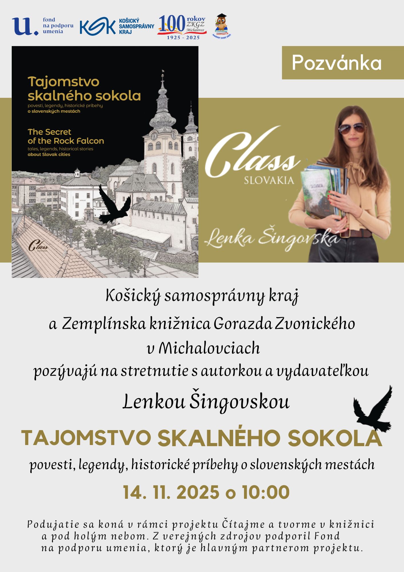 Stretnutie s autorkou a vydavateľkou Lenkou Šingovskou o jej knihe Tajomstvo skalného sokola. Publikácia spája fotografie slovenských miest s legendami a príbehmi, ktoré oživujú históriu a krásu 76 miest Slovenska.
