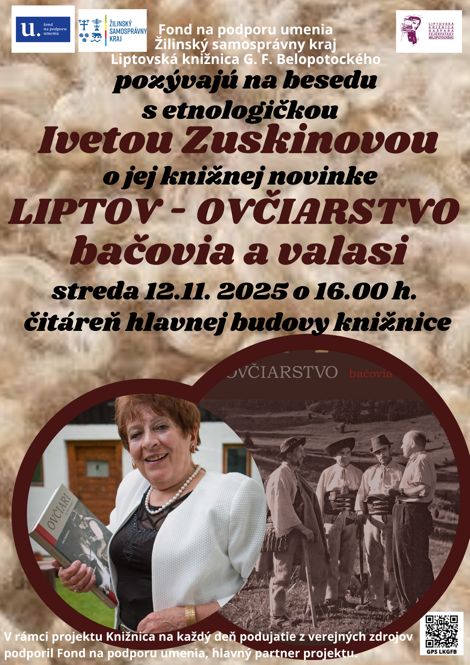 Autorská beseda s Ivetou Zuskinovou o knihe LIPTOV - OVČIARSTVO bačovia a valasi; 12. november 2025 o 16.00 hod. v multimediálnom úseku Liptovskej knižnice GFB.