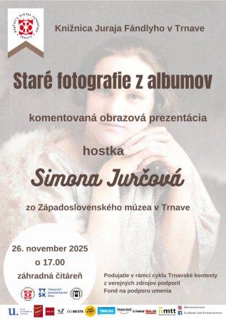 Pozývame vás na stretnutie so Simonou Jurčovou a jej komentovanú prednášku o trnavských fotoateliéroch. Predstavte si, ako to asi vyzeralo, keď sa v roku 1860 objavil na trnavskom námestí fotograf Štefan Dohnányi a rozložil si svoj fotoaparát na statíve... Prezentácia s rozprávaním bude zameraná na históriu fotografovania, na trnavských fotografov a fotoateliéry, ich reklamy a ponuku, ale i na spôsob identifikácie starej fotografie.