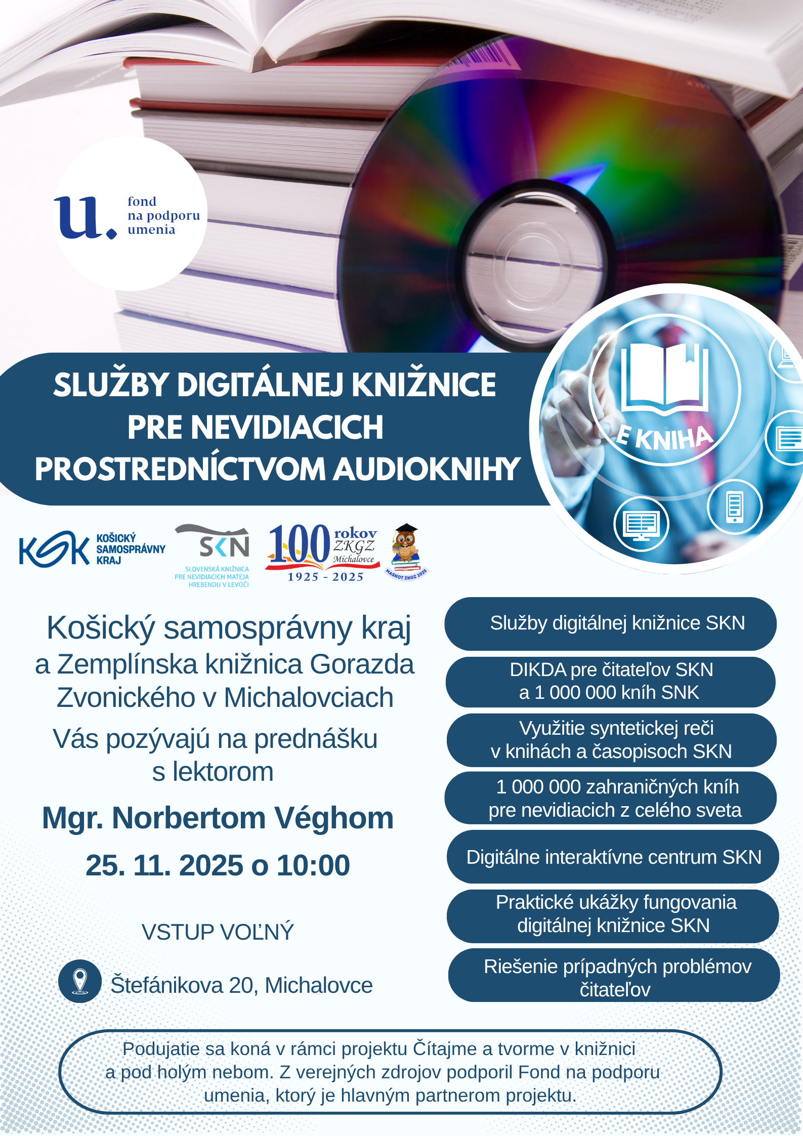Podujatie venované moderným možnostiam prístupu k literatúre pre nevidiacich a slabozrakých. Norbert Vegh predstaví služby digitálnej knižnice Slovenskej knižnice pre nevidiacich Mateja Hrebendu v Levoči, projekt DIKDA a ponuku viac ako milióna titulov. Účastníci spoznajú využitie syntetickej reči v knihách a časopisoch SKN, prístup k zahraničným knihám pre nevidiacich a možnosti Digitálneho interaktívneho centra SKN, vrátane praktickej ukážky fungovania knižnice.
