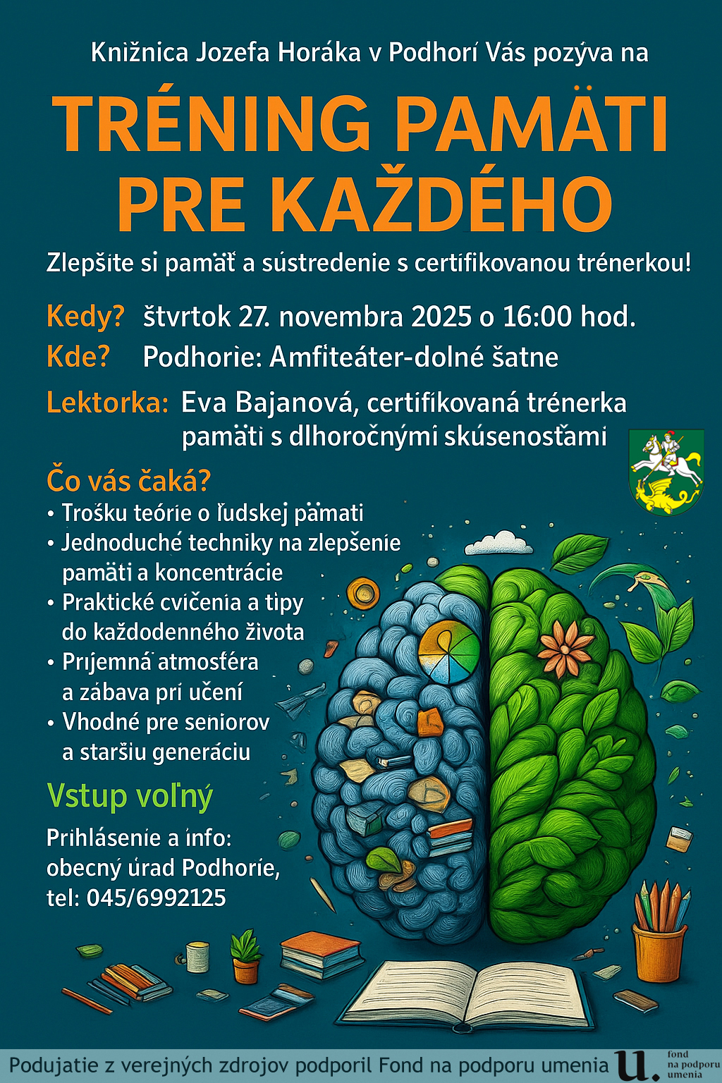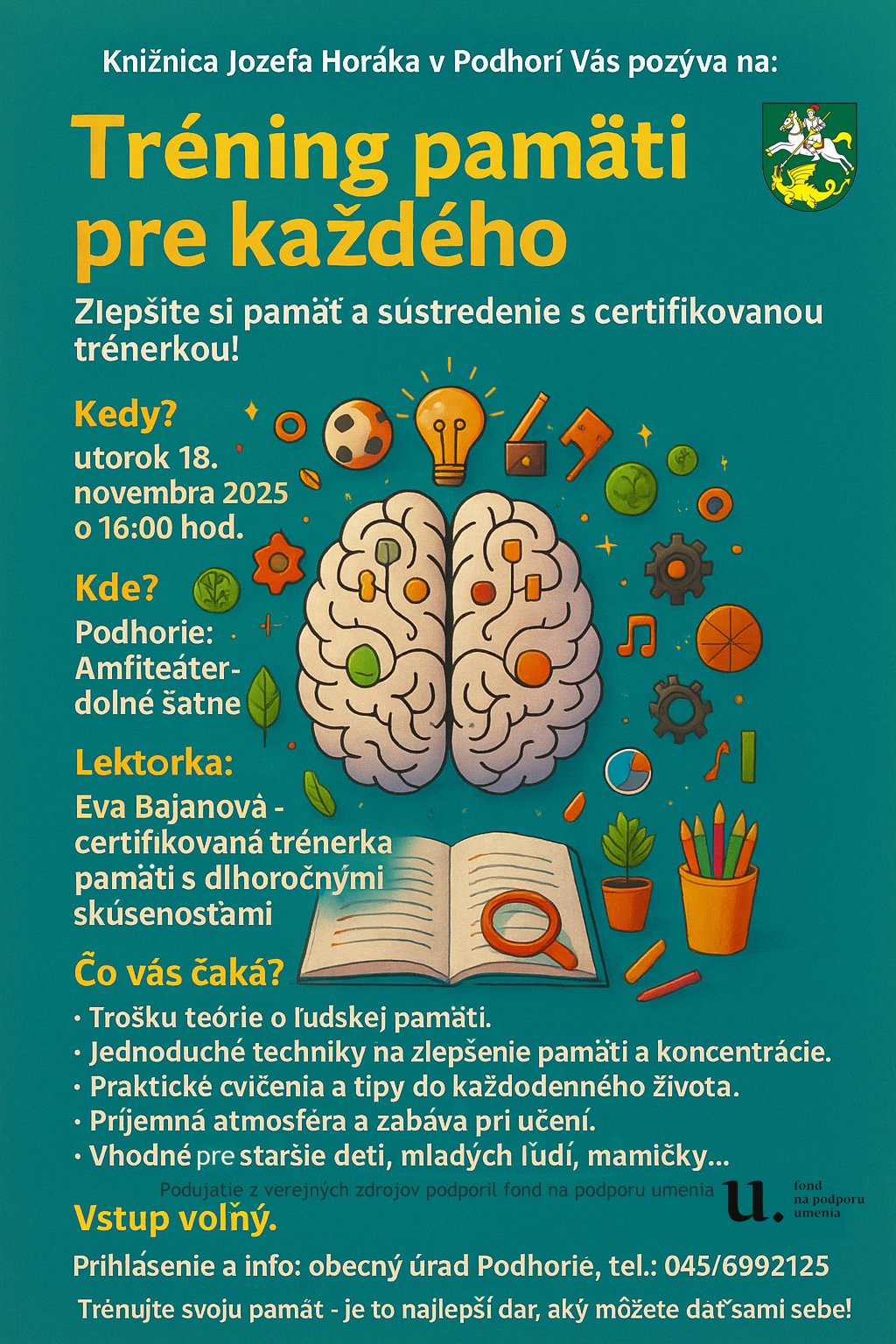 Tréning pamäti pre každého je podujatie s certifikovanou lektorkou pani Evou Bajanovou, určené najmä pre staršie deti, rodičov, mamičky.