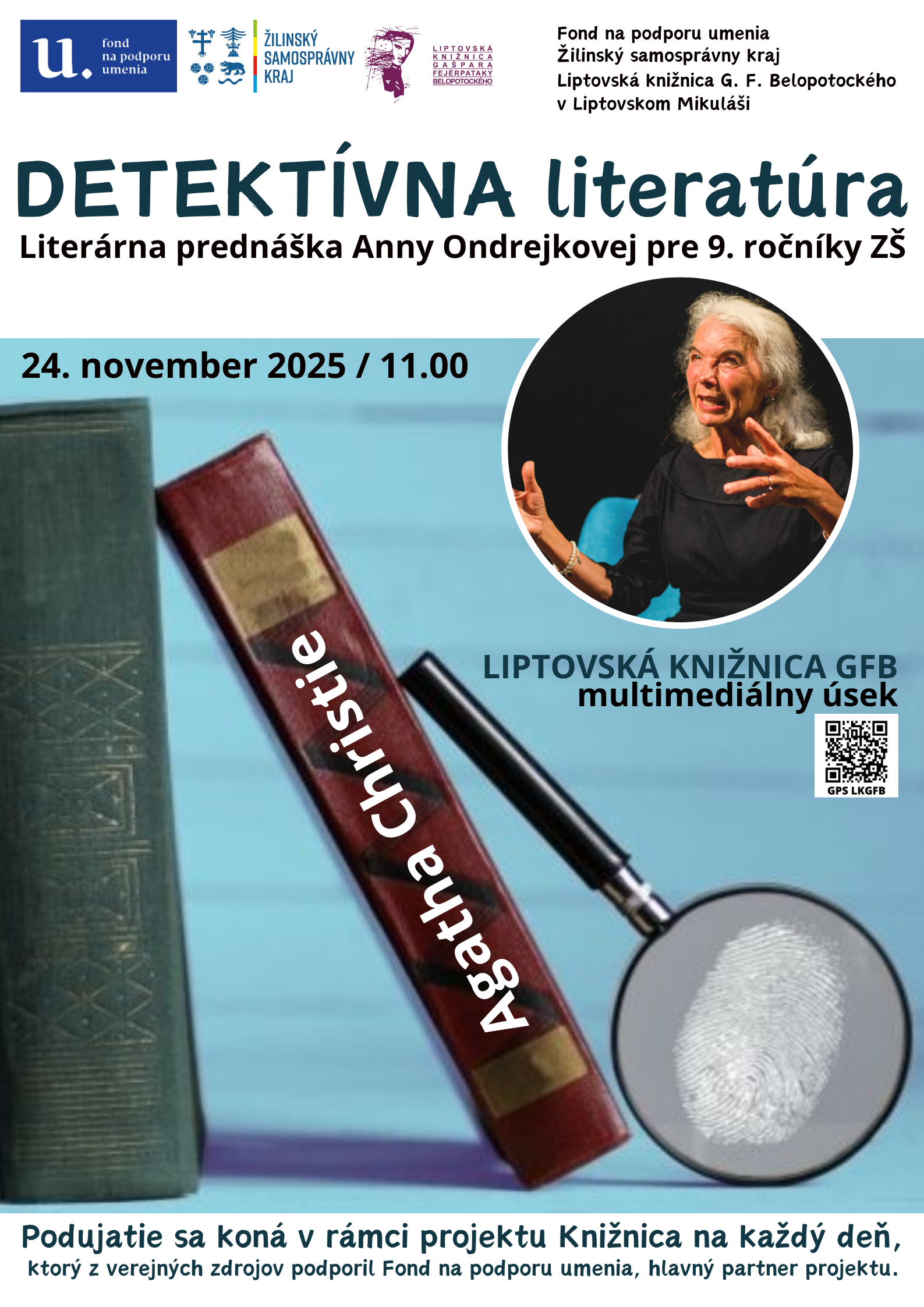Literárna prednáška Anny Ondrejkovej – Detektívna literatúra (1x), 24.11.2025 o 11.00 hod. v multimediálnom úseku