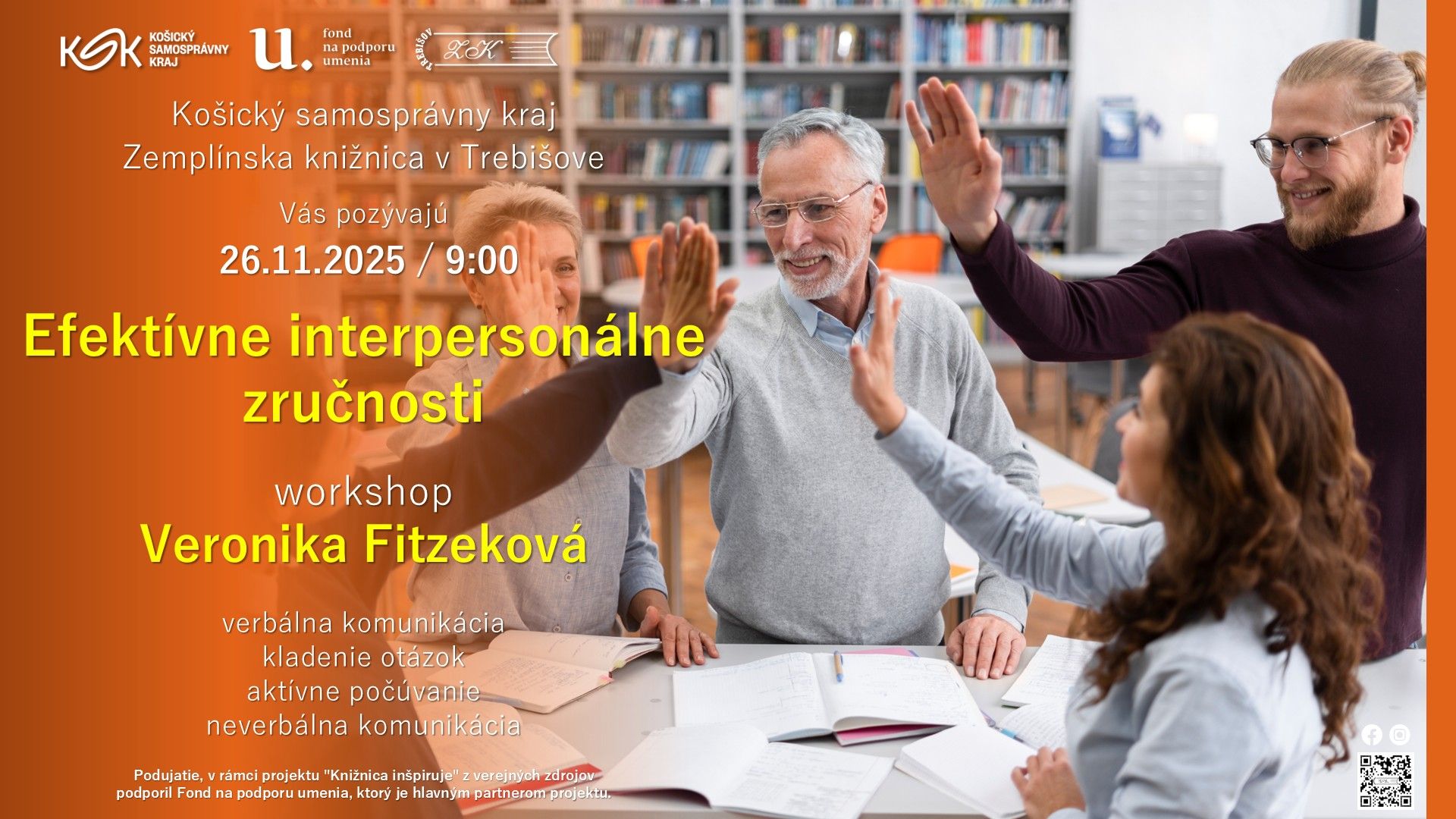 Pestrá paleta podujatí, ktoré umožnia návštevníkom stretávať a vzdelávať sa, rozvíjať svoje zručnosti a užívať svoj voľný čas v priateľskej a podpornej atmosfére. Projektom vyzdvihujeme pozitívny vzťah k literatúre a k vzdelávaniu, cez osobný kontakt s tvorcami literatúry a osobnosťami spoločenského života, pre každého, od detí v najútlejšom veku až po seniorsky vek.