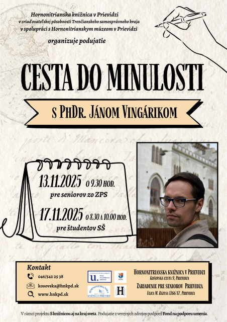 Fenoménom 21. storočia je žiť prítomnosťou, či dokonca budúcnosťou. To aká budúcnosť nás čaká, však do veľkej miery ovplyvňuje naša minulosť. Je preto dôležité obzrieť sa do histórie a poučiť sa z nej. Na besede Cesta do minulosti návštevníkom Hornonitrianskej knižnice v Prievidzi regionálny historik Ján Vingárik z Hornonitrianskeho múzea v Prievidzi priblíži zaujímavé, dôležité a často aj tragické udalosti a momenty, ktoré formovali naše mesto v minulých storočiach.