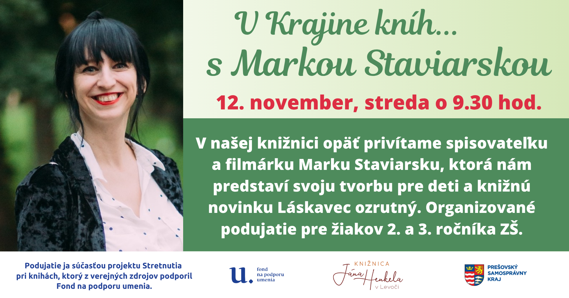 V rámci cyklu podujatí Krajina kníh sme si pre žiakov ZŠ pripravili stretnutie s autorkou kníh pre deti Markou Staviarskou.