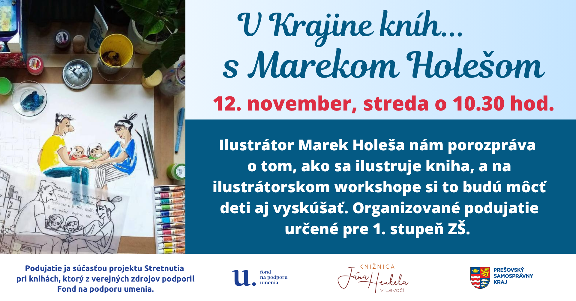 V rámci cyklu podujatí Krajina kníh sme pre žiakov ZŠ pripravili stretnutie s výtvarníkom a ilustrátorom Marekom Holešom, ktorý pre deti zároveň pripraví malý ilustrátorský workshop.