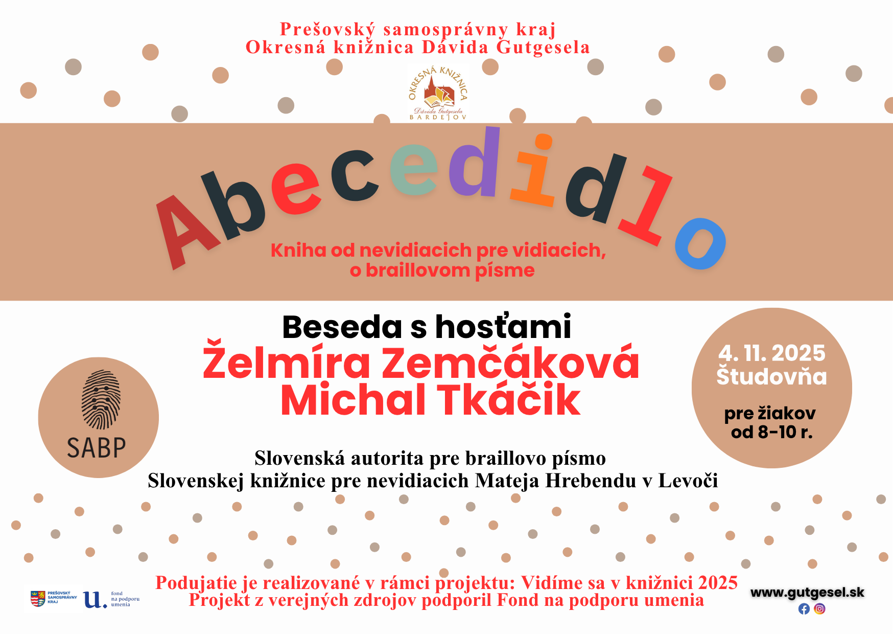 Besedy pre deti a mládež s hosťami Želmírou Zemčákovou a Michalom Tkáčikom (Slovenská autorita pre braillovo písmo Slovenskej knižnice pre nevidiacich Mateja Hrebendu v Levoči) ku knihe Abecedidlo - kniha od nevidiacich pre vidiacich o braillovom písme.