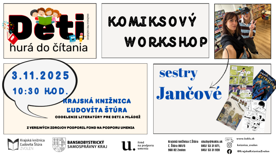 Krajská knižnica Ľudovíta Štúra srdečne pozýva verejnosť na komiksový workshop s Ivanou a Zuzanou Jančovou. Sestry Ivana a Zuzana Jančové, známe tvorkyne slovenských komiksov, tvoria unikátny tím.