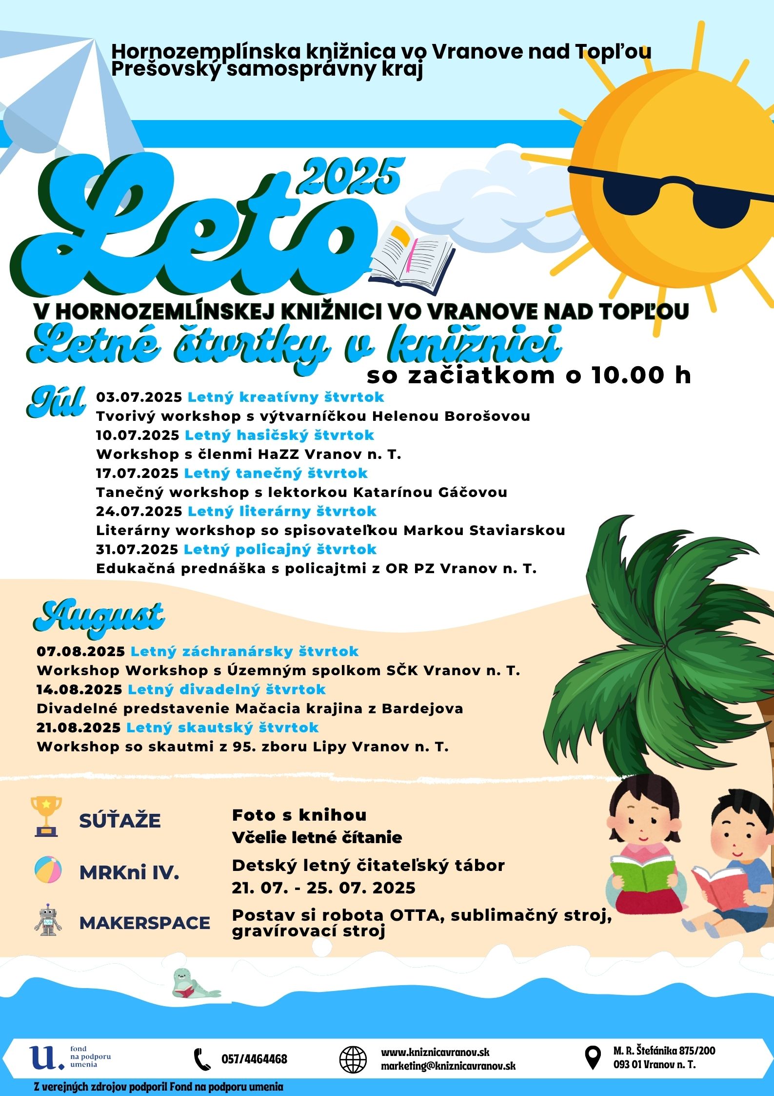 Hornozemplínska knižnica vo Vranove nad Topľou pripravuje počas letných prázdnin množstvo zaujímavých podujatí pre prázdninujúce deti, ich rodičov, ale aj starých rodičov. Pre všetkých návštevníkov sme pripravili bohatý program pod vedením skúsených lektorov. Aktivity budú zamerané na podporu čítania, rozvoj fantázie a kreatívnych zručností.