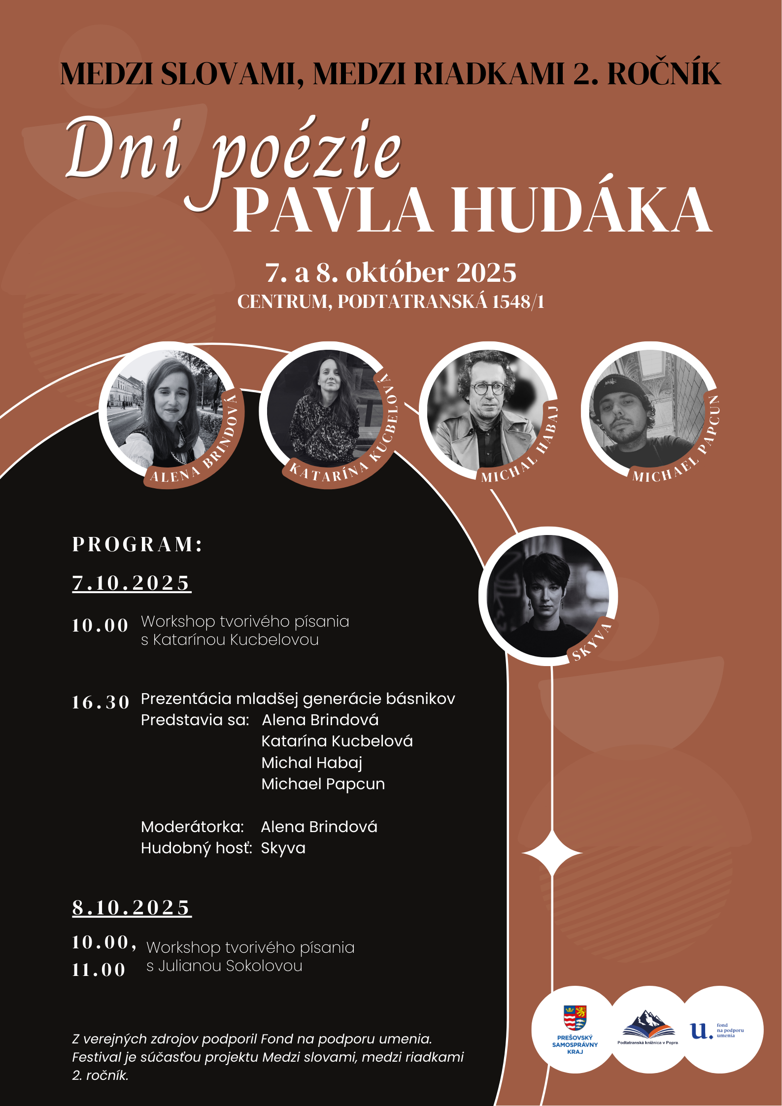 V rámci festivalu Dni poézie Pavla Hudáka sa počas literárneho večera predstaví mladšia generácia básnikov. Súčasní autori predvedú, ako znie poézia, ktorá má pred sebou autorskú budúcnosť.