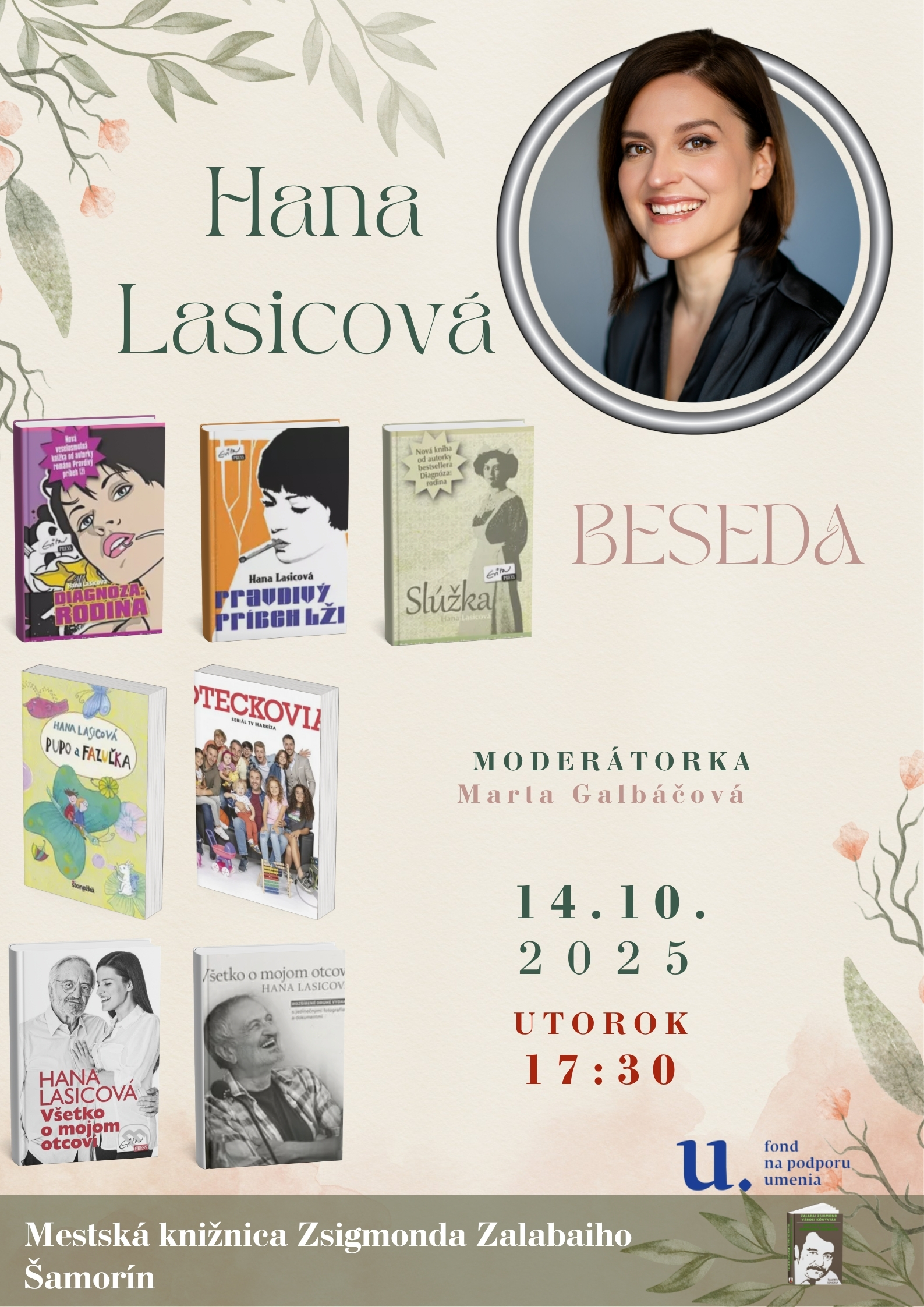Autorská beseda so spisovateľkou Hanou Lasicovou o jej tvorbe, scenároch a najnovšej knihe venovanej otcovi – Milanovi Lasicovi. Moderuje Marta Galbáčová.