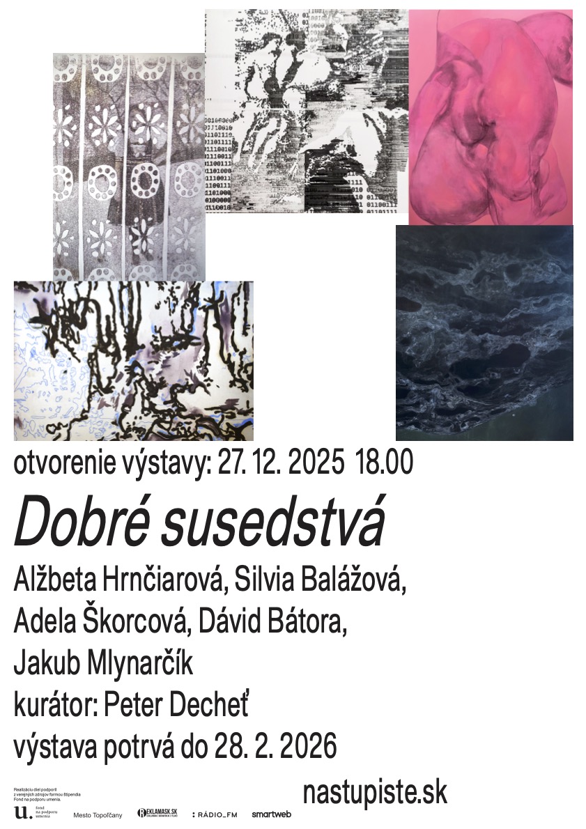 Srdečne pozývame na otvorenie výstavy Dobré susedstvá autorky a autori: Alžbeta Hrnčiarová, Silvia Balážová, Adela Škorcová, Dávid Bátora, Jakub Mlynarčík Kurátor: Peter Decheť Vernisáž: 27.12.2025 o 18:00 hod, Nástupište 1-12, podchod AS Topoľčany