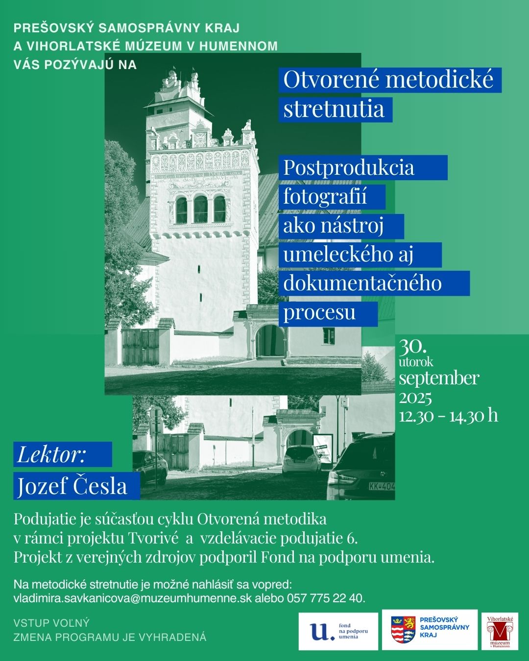 Podujatie v rámci aktivity Otvorená metodika, tentokrát zamerané na vizuálne umenie. Téma otvoreného metodického stretnutia bude Postprodukcia fotografií ako nástroj umeleckého aj dokumentačného procesu. Lektor: Jozef Česla
