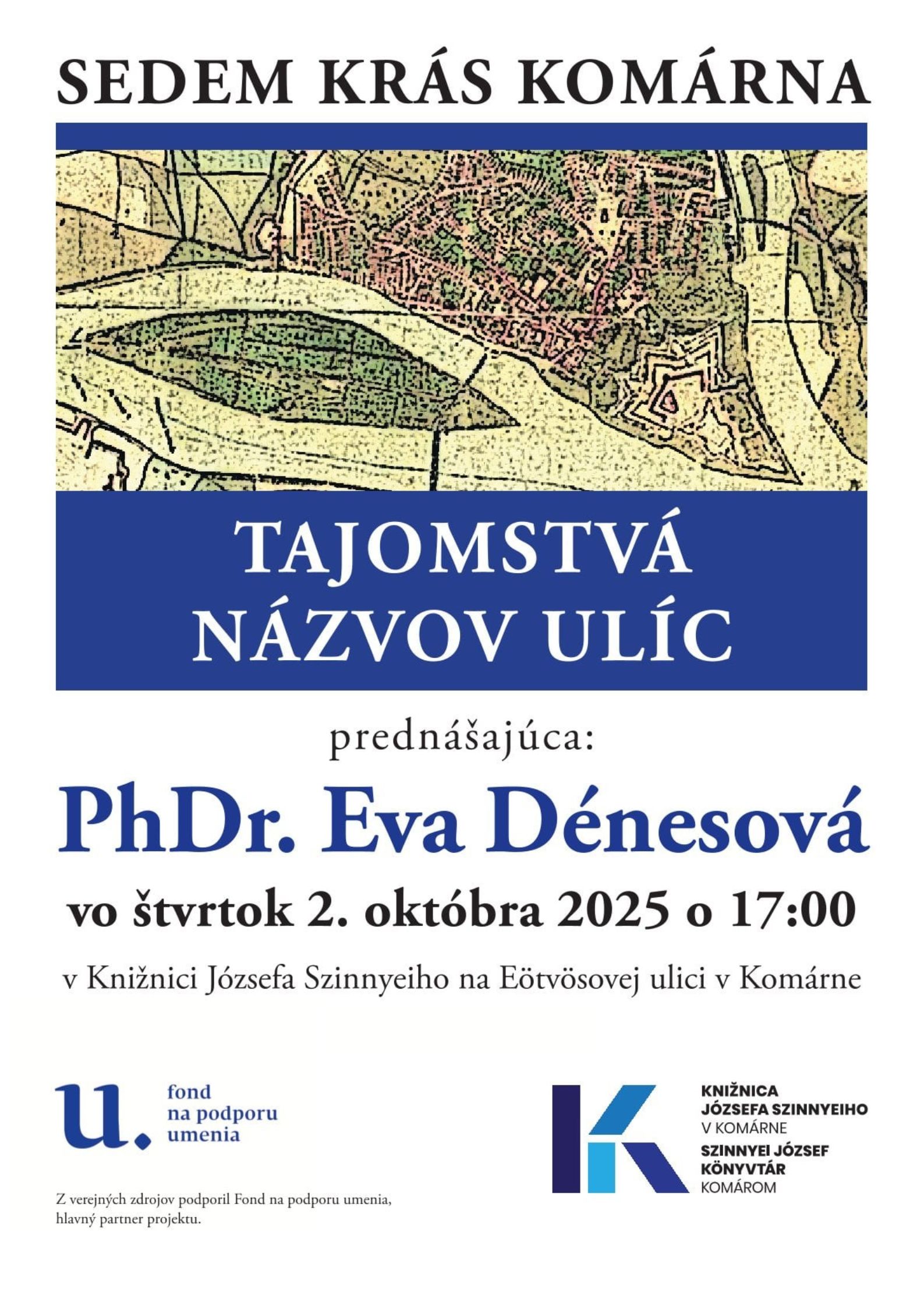 Pozývame vás na prednášku PhDr. Evy Dénesovej, historičky umenia, ktorá priblíži históriu sôch a názvov ulíc v Komárne. Dozviete sa, aké príbehy a osobnosti sa skrývajú za sochami i názvami ulíc, ako sa menili v priebehu času a čo prezrádzajú o minulosti mesta. Podujatie ponúkne zaujímavý pohľad na kultúrne dedičstvo Komárna.
