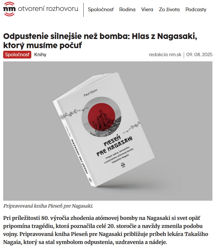 Vydavateľstvo Nové mesto publikovalo na portáli nm.sk texty súvisiace s knihou Pieseň pre Nagasaki. Jeden z článkov priniesol redakčne spracovanú informáciu o pripravovanom slovenskom vydaní knihy pri príležitosti 80. výročia zhodenia atómovej bomby na Nagasaki. Druhý text predstavil úryvok z publikácie a priblížil jej tematické zameranie.