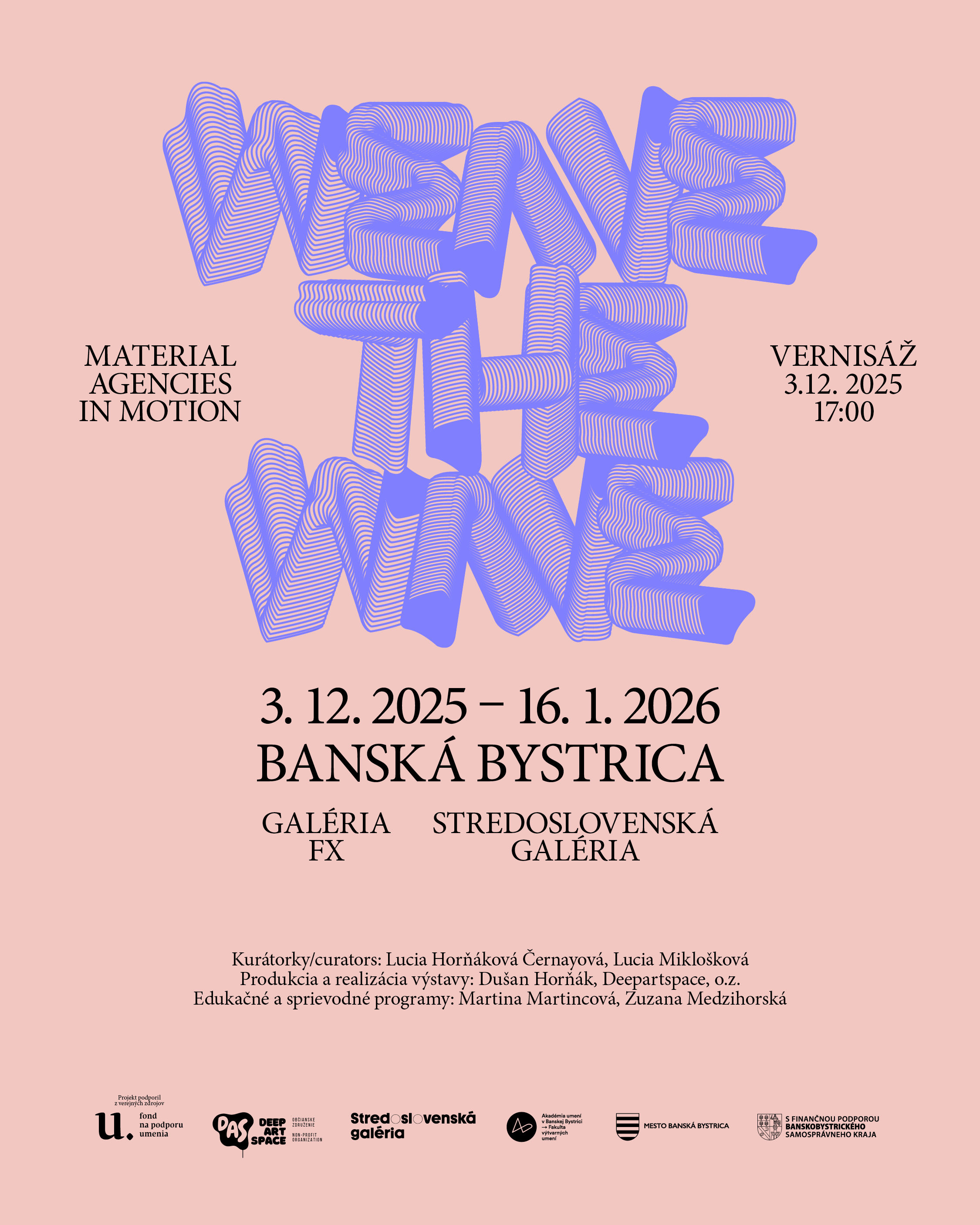 Medzinárodná výstava „Weave Wave: Material Agencies in Motion“ predstaví šírku prístupov súčasného fiberartu v stredoeurópskom kontexte a ponúkne diela, ktoré reflektujú dynamiku a vzťahy medzi materiálmi a významami v rámci širšieho ekologického a kultúrneho prostredia. Vybrané diela skúmajú vlákna, ich výrobu, technologické postupy a estetické vlastnosti s ohľadom na environmentálne, sociálne a kultúrne aspekty.