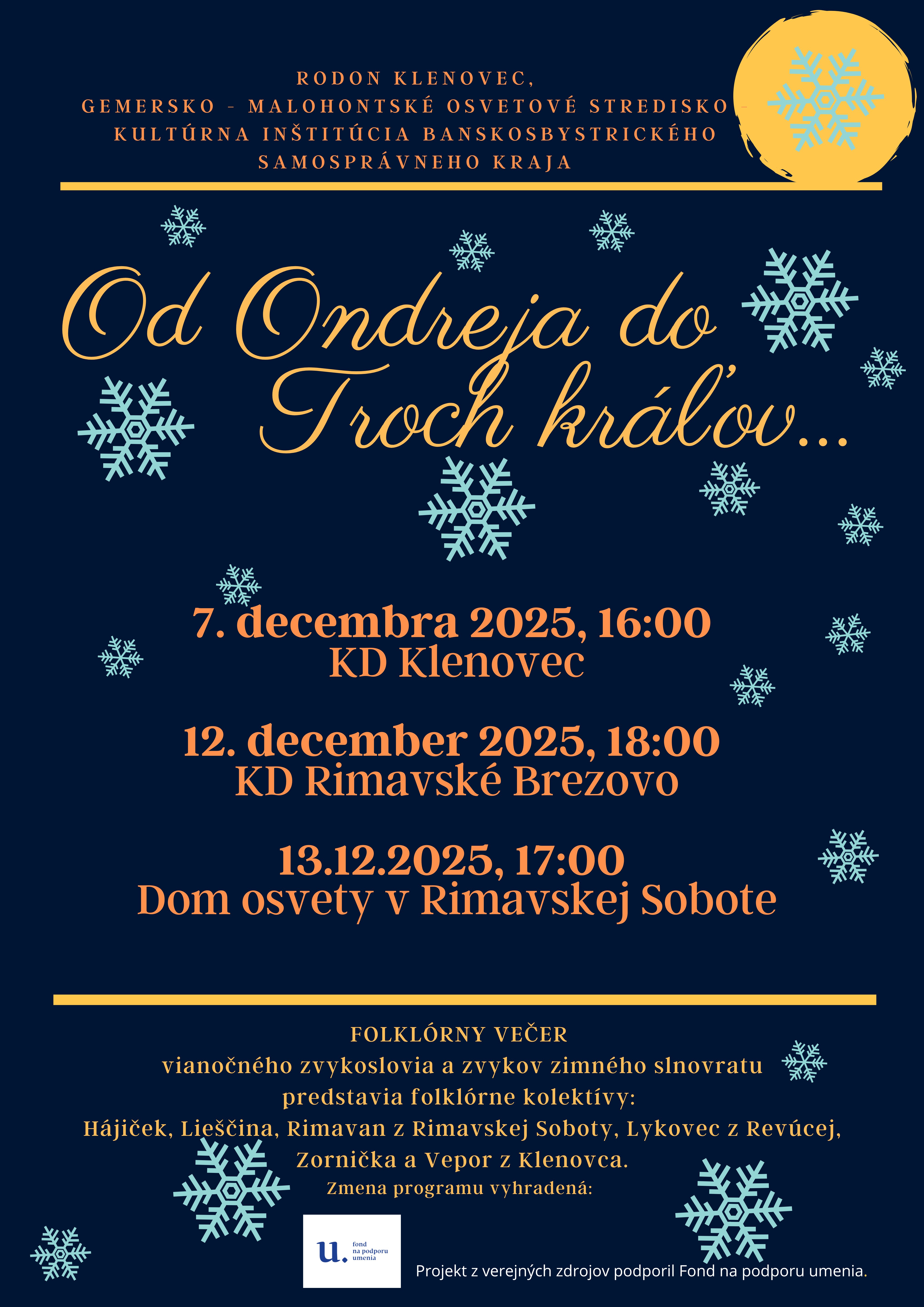 Scénické dielo Od Ondreja do Troch kráľov prezentuje zvykoslovie zimného cyklu a zimného slnovratu z regiónu Gemer - Malohont. Cieľom je predstaviť časti výskúmného materiálu v rámci komponovaného scénického diela v spolupráci s folklórnymi kolektívmi a sólistami žijúcich a pôsobiacich v regióne, a to: FS Vepor, DFS Zornička z Klenovca, FS Rimavan, DFS Hájiček, FSk Lieščina z Rimavskej Soboty, FS Lykovec z Revúcej, a Kadlubských Betlehemcov.