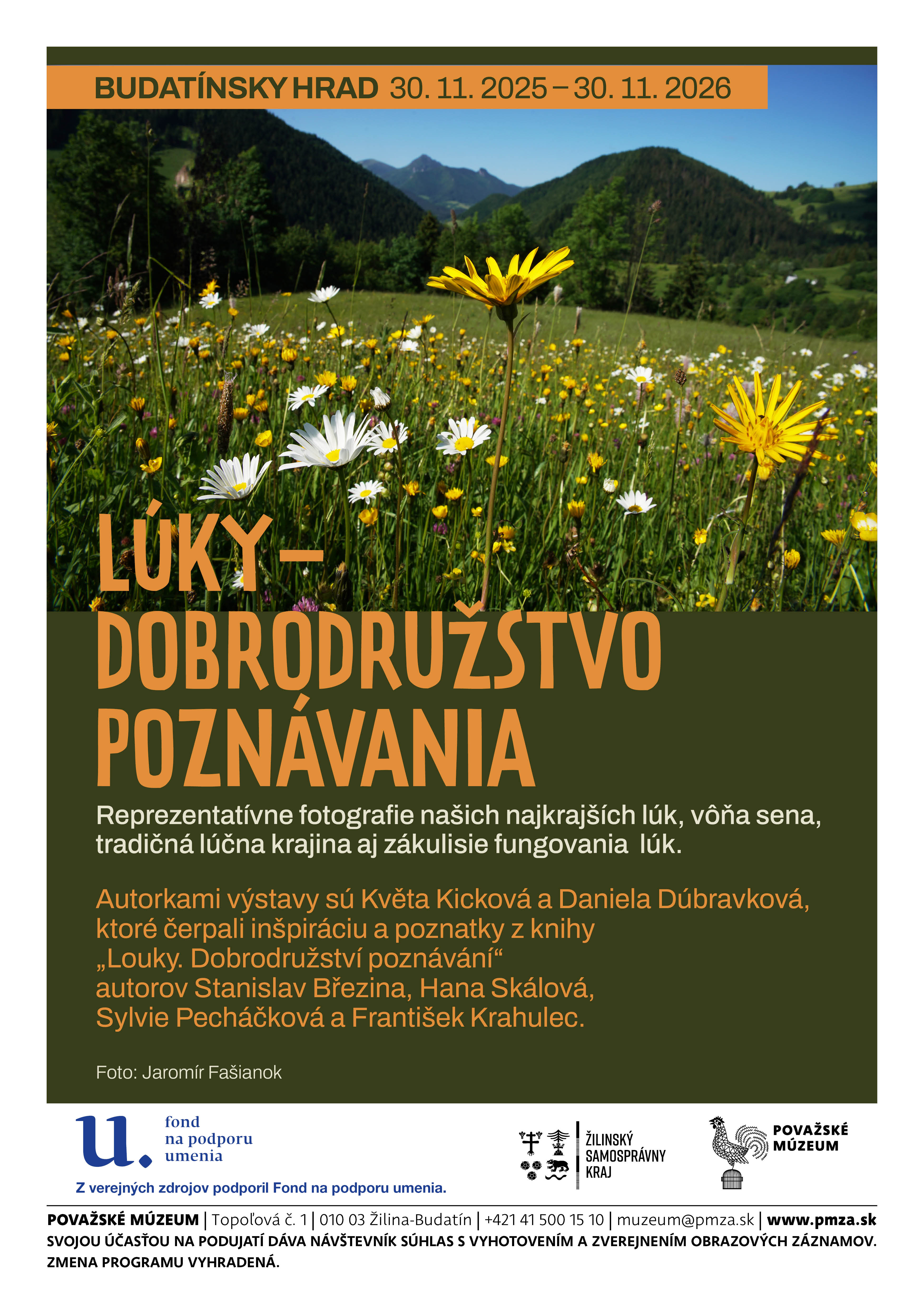 Autorkami výstavy Lúky/dobrodružstvo poznávania sú Květa Kicková a Daniela Dúbravková, ktoré čerpali z publikácie Louky. Dobrodružství poznávání. Kvetnaté lúky patria k najpestrejším a najohrozenejším biotopom Slovenska. Výstava predstavuje ich krásu prostredníctvom výberu fotografií Jaroslava Košťála. Návštevníci objavujú prečo sú slovenské kvetnaté lúky také výnimočné, čo im hrozí v súčasnosti a akú úlohu zohrávalo tradičné hospodárenie pri formovaní ich biodiverzity.