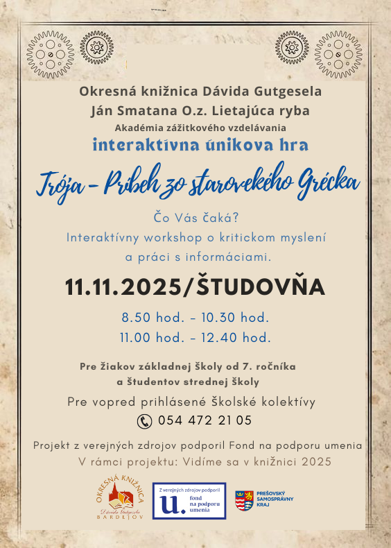 Interaktívne vzdelávacie workshopy z oblasti kritického myslenia a práce s infomáciami pre žiakov ZŠ od 7. ročníka a študentov SŠ s lektorom Jánom Smatanom z O.Z. Lietajúca ryba. Téma workshopu Trója - Príbeh zo starovekého Grécka.