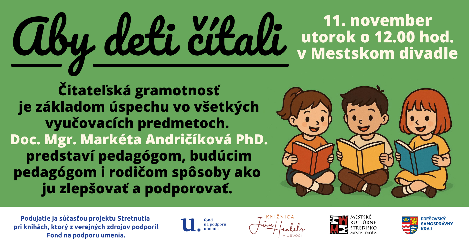Pozývame vás na odborný seminár Aby deti čítali. Čitateľská gramotnosť je základom úspechu vo všetkých vyučovacích predmetoch. Doc. Mgr. Markéta Andričíková PhD. predstaví pedagógom, budúcim pedagógom i rodičom spôsoby ako ju zlepšovať a podporovať.