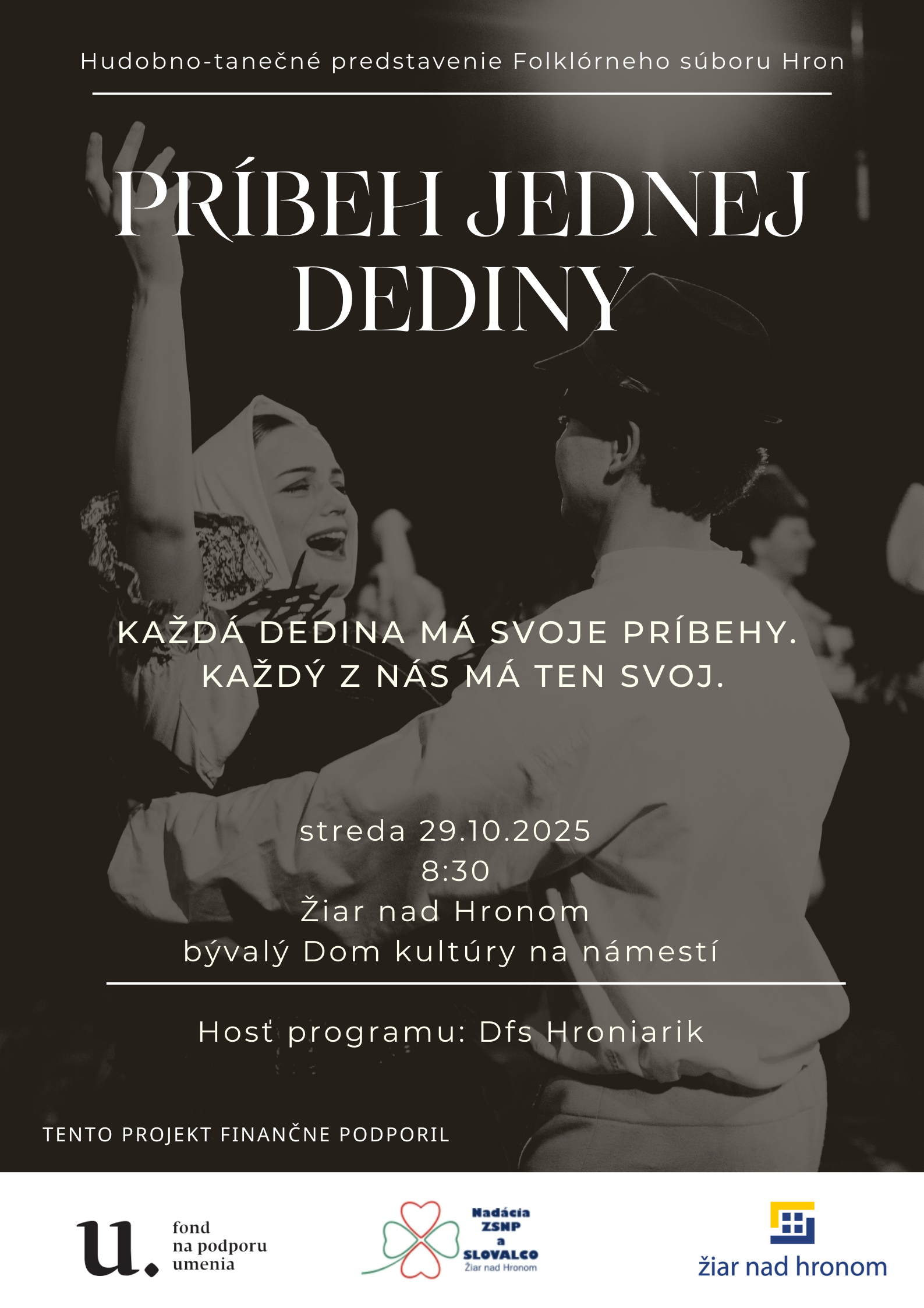 Každá dedina má svoje príbehy. Každý z nás má ten svoj. Folklórny súbor Hron zrealizoval na jedinečné autorské predstavenie Príbeh jednej Dediny, plné hudby, tanca a emócií. Diváci videli príbehy obyčajných ľudí, ktorí nachádzajú silu v sebe a oporu v druhých. Ich každodenné radosti aj starosti. A možno v ich príbehoch spoznali aj ten svoj.