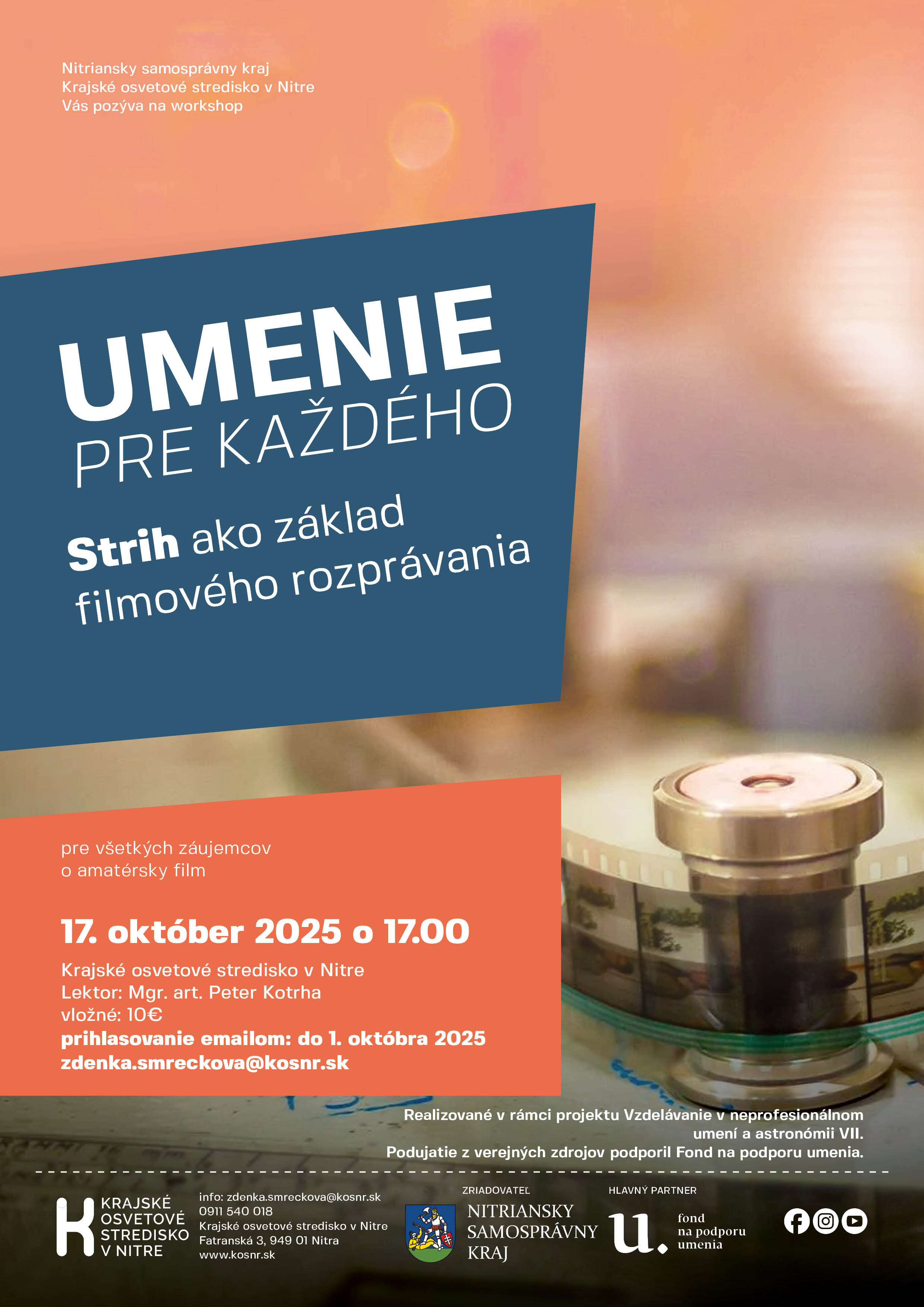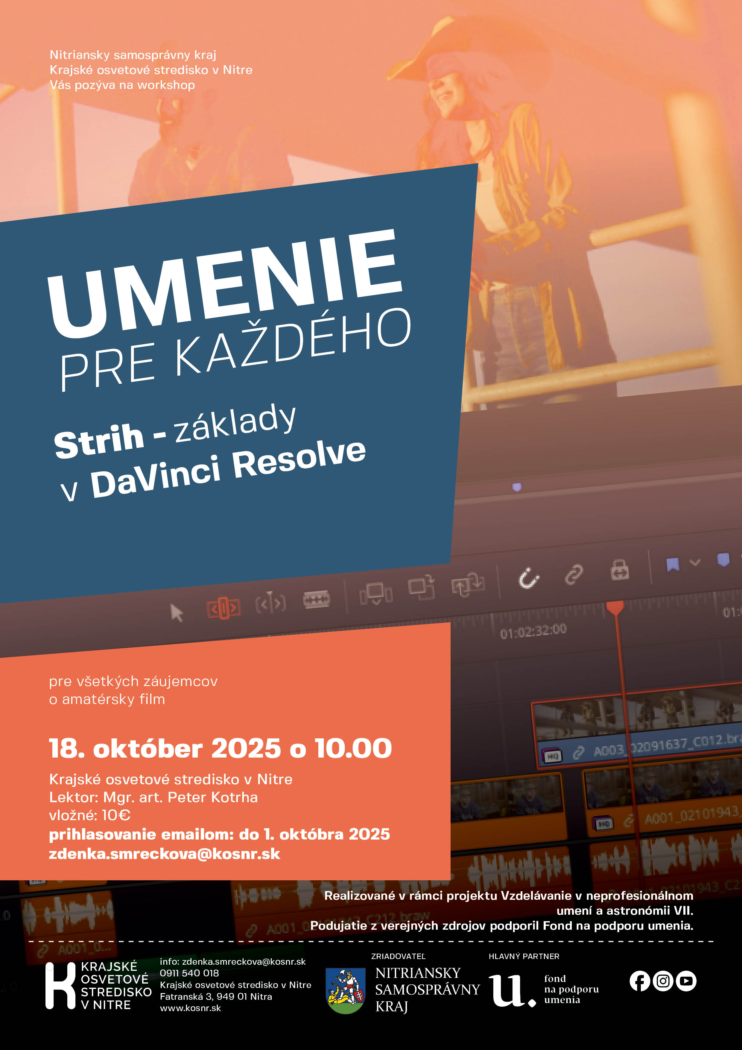 workshop pre amatérskych filmárov, pre všetkých, ktorí si chcú rozšíriť svoje zručnosti o nové digitálne nástroje a vytvárať vlastný audiovizuálny obsah lektor: Mgr.art. Peter Kotrha kde: Krajské osvetové stredisko v Nitre