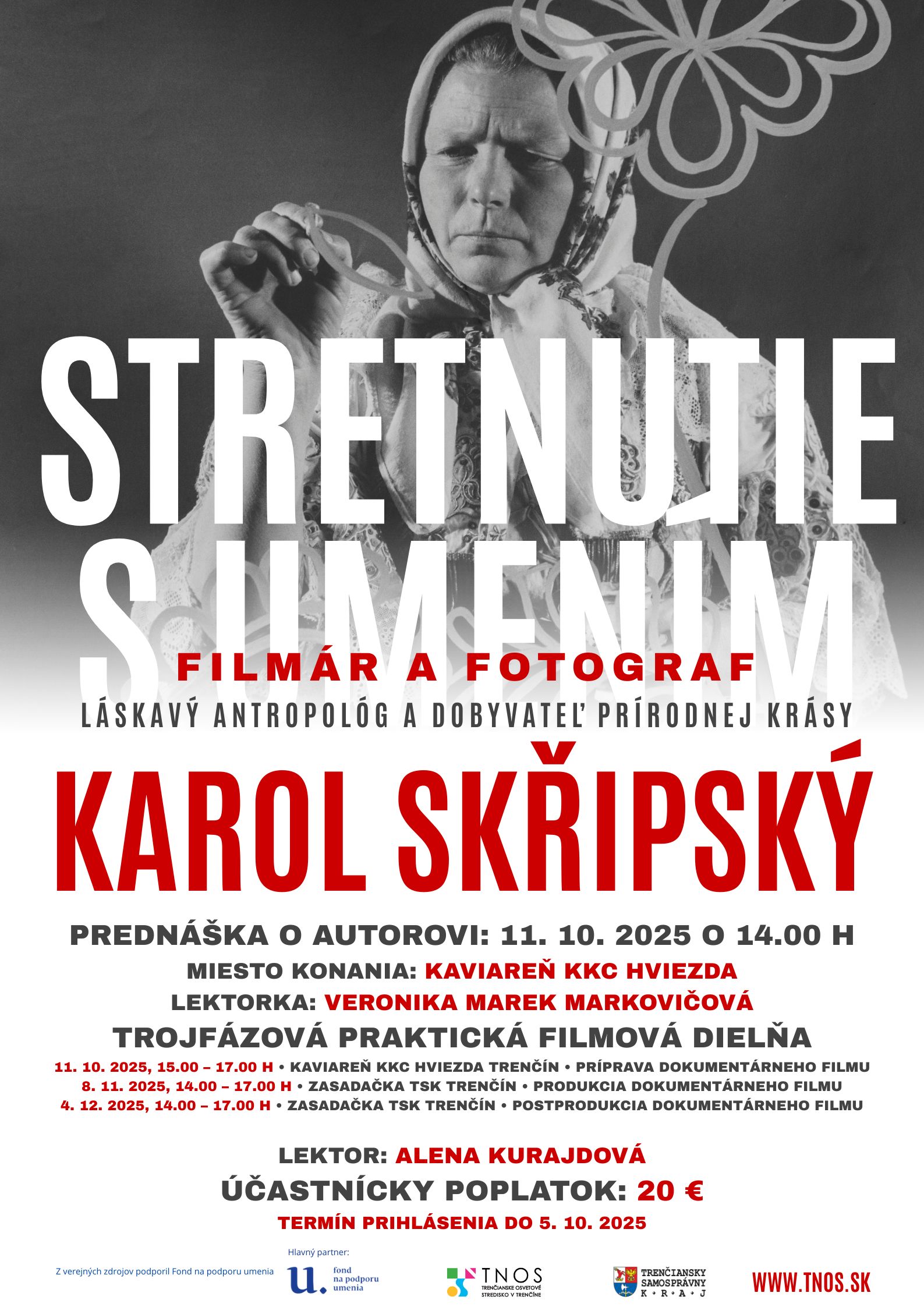 Trenčianske osvetové stredisko v Trenčíne Vás pozýva na druhé podujatie v rámci cyklu STRETNUTIE S UMENÍM. Venované je významnej osobnosti slovenského dokumentárneho filmu filmárovi a fotografovi Karolovi Skřipskému.