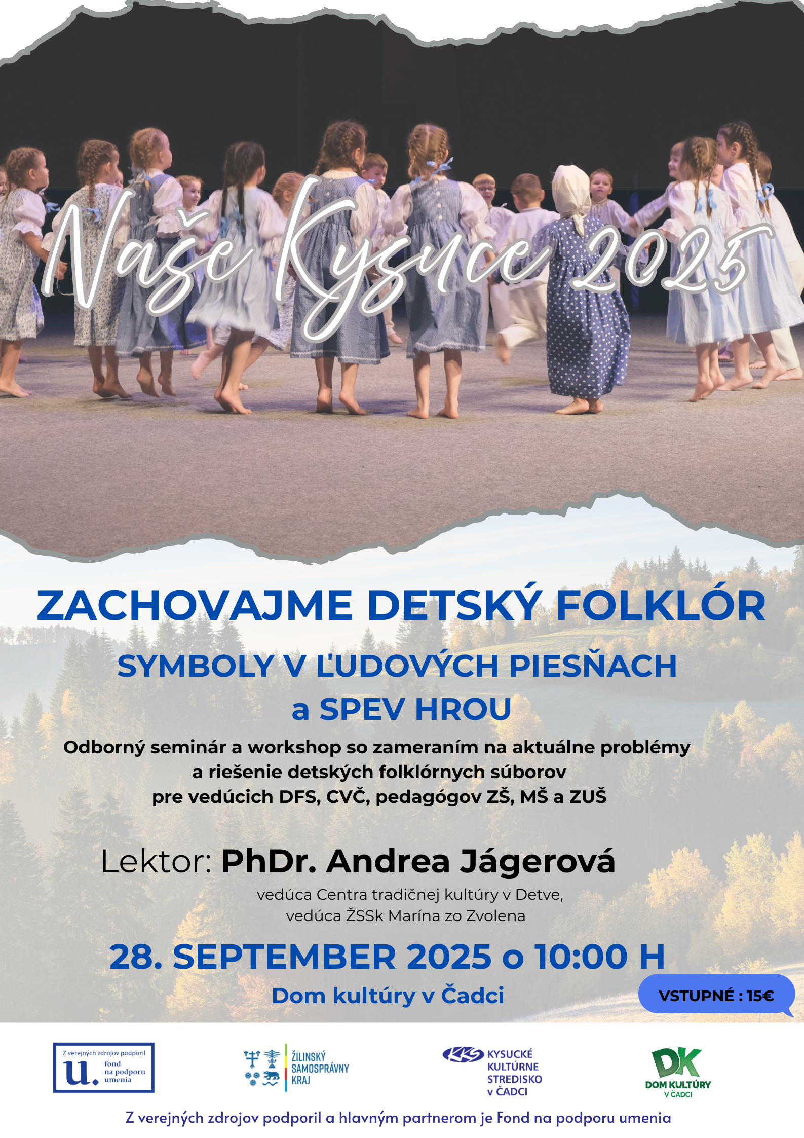 Odborný seminár a workshop so zameraním na aktuálne problémy a riešenie detských folklórnych súborov pre vedúcich DFS, CVČ, pedagógov ZŠ, MŠ a ZUŠ.