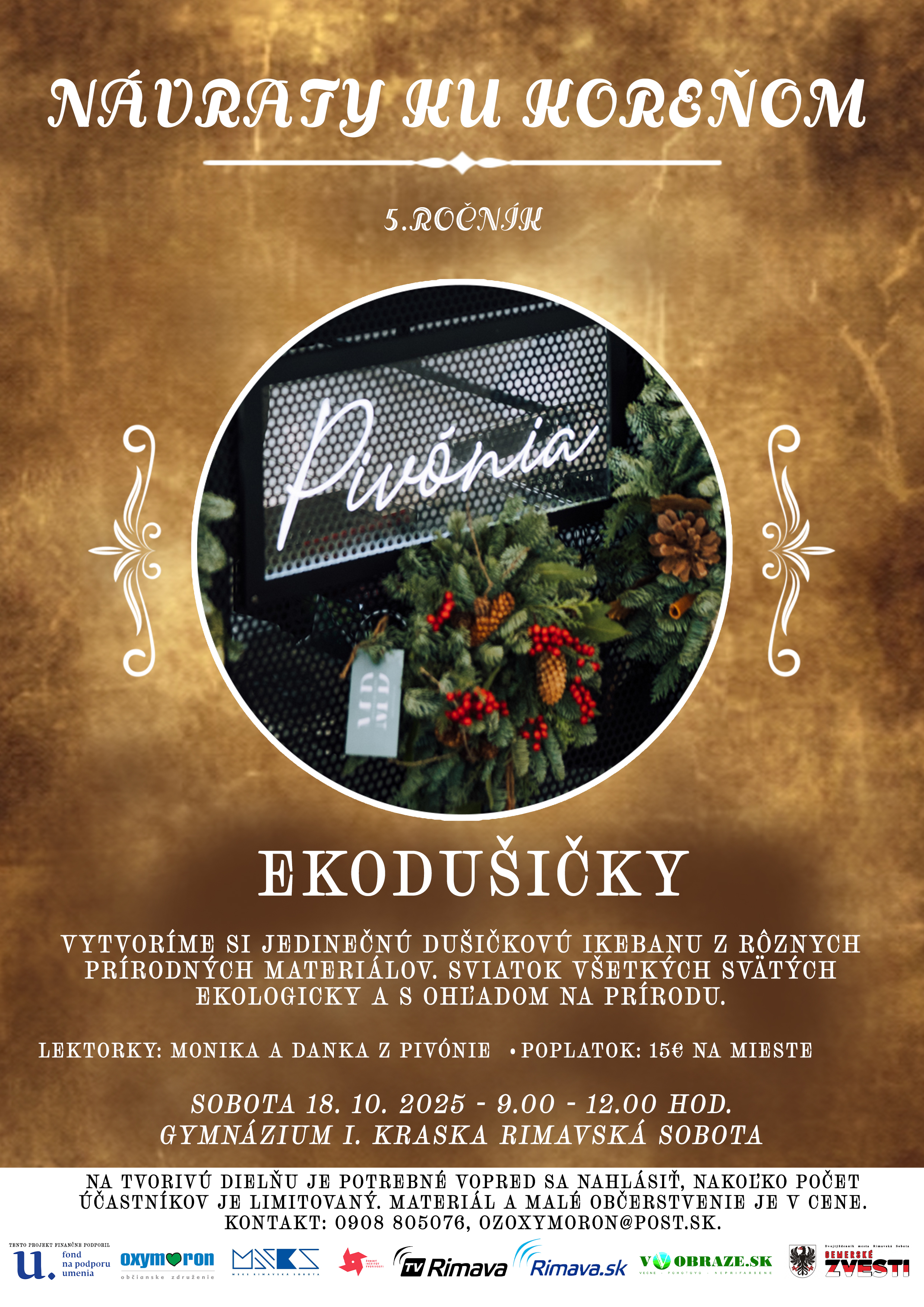 Štvrtý kurz, na ktorom si spoločne vytvoríme jedinečnú dušičkovú ikebanu z rôznych prírodných materiálov – živých kvetov, halúzok, šišiek, vetvičiek a ďalších darov prírody. Bez použitia umelých materiálov sa naučíte ako pristupovať k sviatku Všetkých svätých s rešpektom a zmyslom pre udržateľnosť. Podujatie z verejných zdrojov podporil FPU.