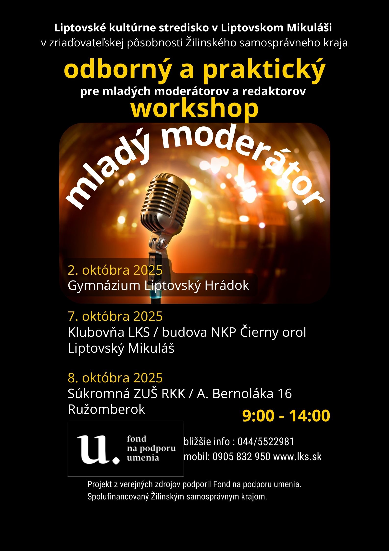 Workshop, na ktorom si zlepšíš moderátorské a jazykové schopnosti a získaš istotu pri zvládaní súťažných disciplín. Je určený pre všetkých záujemcov o moderovanie. Počas workshopu sa zameriame na jednotlivé súťažné disciplíny – spravodajský text, reklama, vlastná relácia, rozhovor a reportáž. Povieme si, na čo je dôležité si dávať pozor pri moderovaní. Súčasťou krajskej súťaže Mladý moderátor 2025