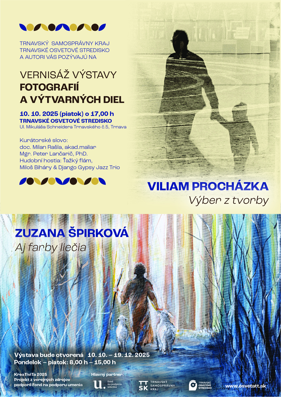 Trnavské osvetové stredisko dňa 10. 10. 2025 o 17,00 h slávnostne otvorí vo výstavnom priestore Domu hudby Mikuláša Schneidera Trnavského výstavu fotografií a výtvarných diel. Výstava je venovaná fotografovi Viliamovi Procházkovi a Zuzane Špirkovej. Výstavnú kolekciu, ktorú tvorí 33 fotografií a 21 výtvarných diel majú možnosť vidieť návštevníci Trnavského osvetového strediska do 19. 12. 2025. Výstava je súčasťou projektu KreaTiviTa 2025.