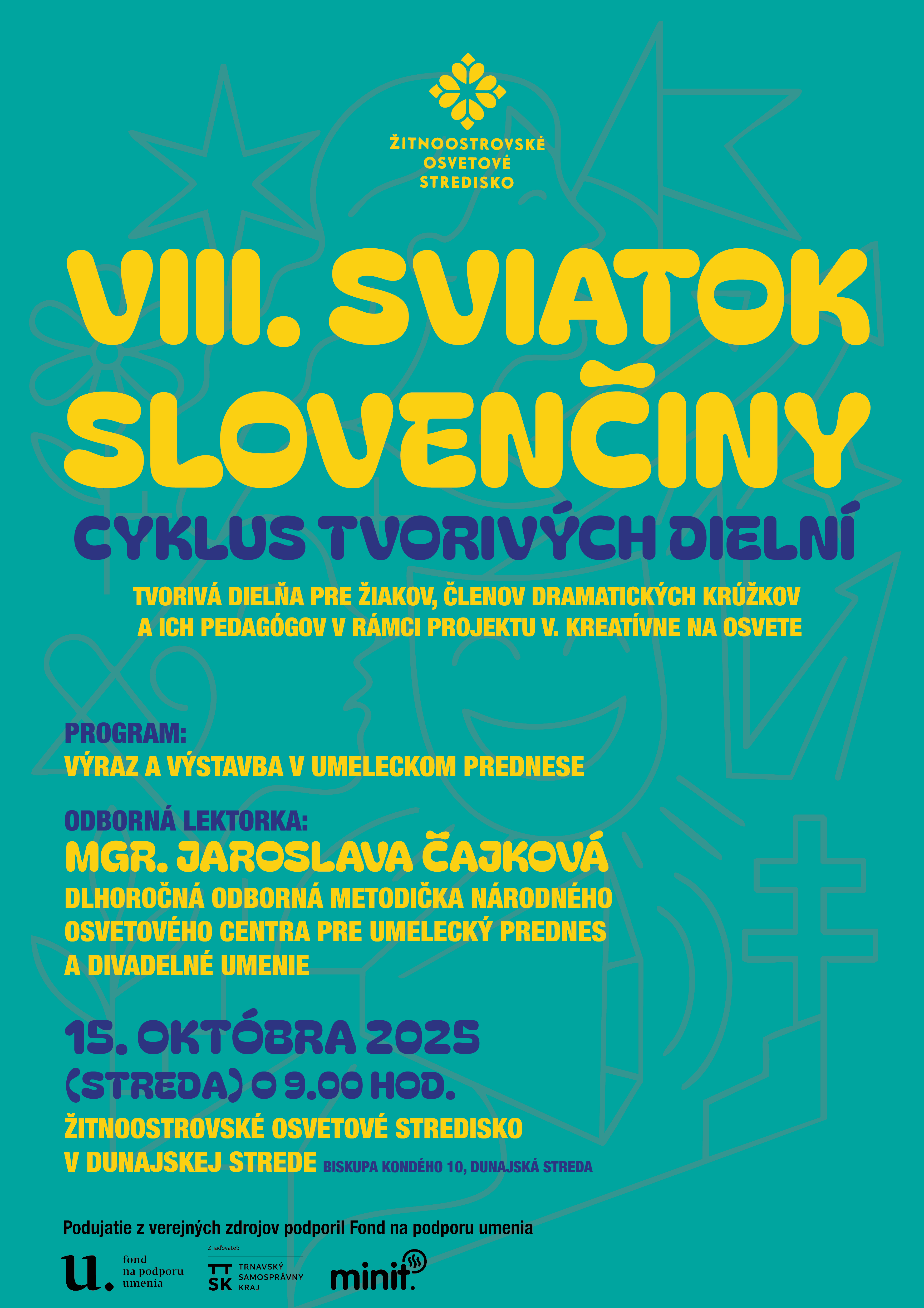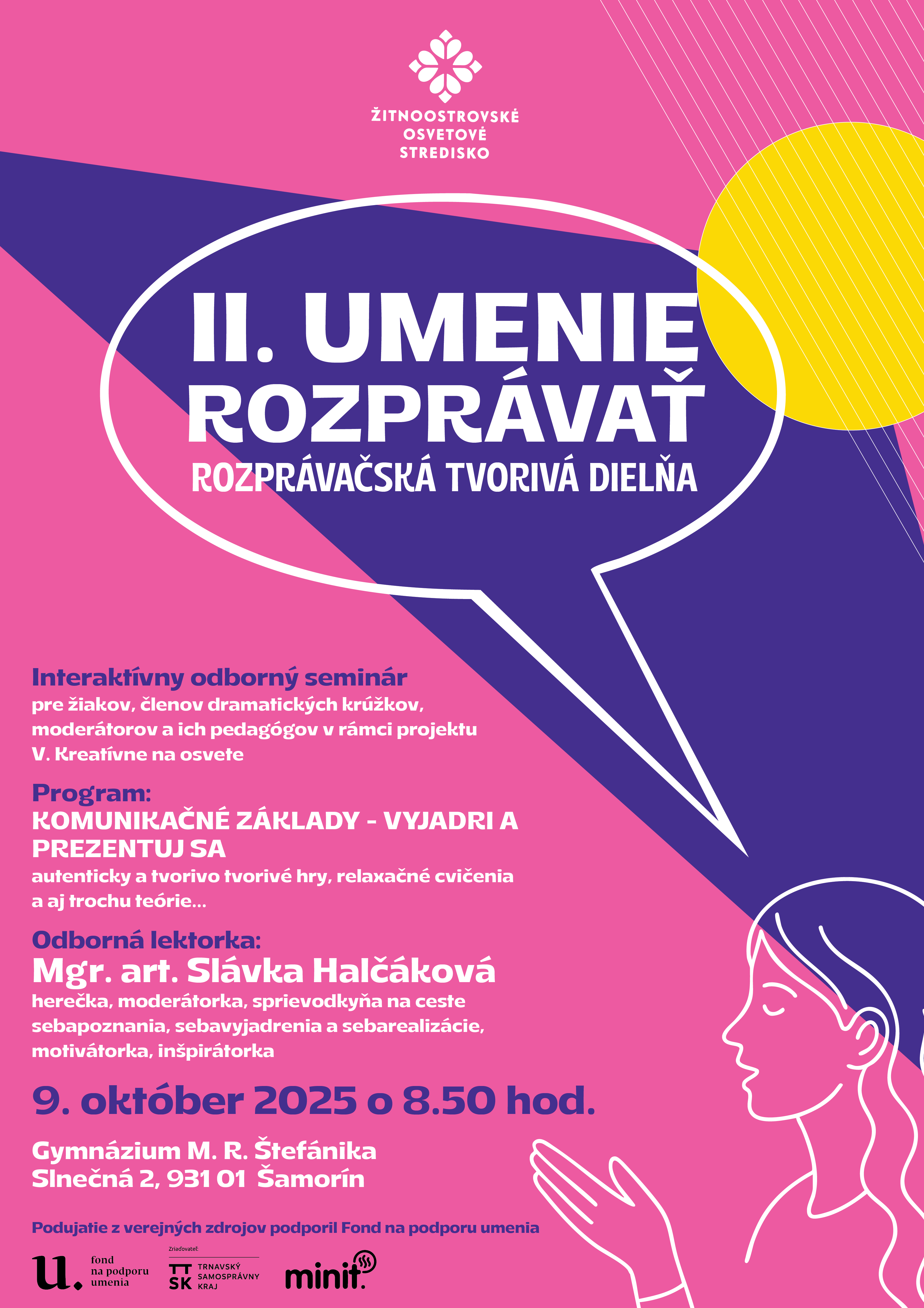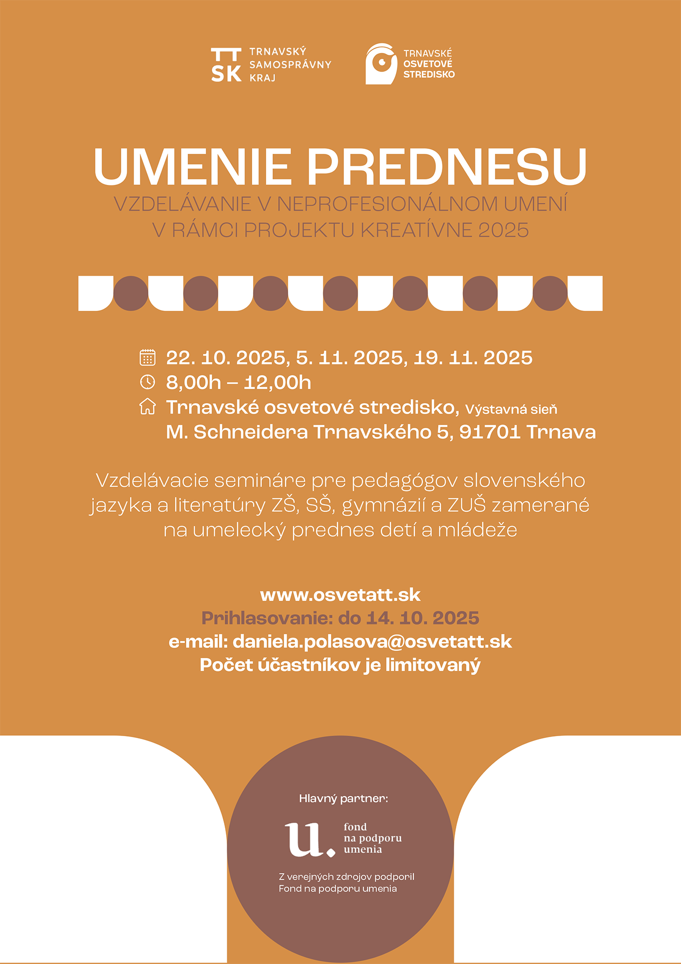 Trnavské osvetové stredisko v Trnave pripravilo pre pedagógov základných škôl, ZUŠ, gymnázií a stredných škôl na vzdelávacie semináre UMENIE PREDNESU, ktoré je súčasťou projektu KREATÍVNE 2025. Semináre sa uskutočnia v dňoch 22.10.2025, 5.11.2025 a 19.11.2025 vo výstavnej sieni TOS. Vzdelávacie podujatie je určené pre pedagógov, ktorí pripravujú recitátorov na prednes. Kapacita vzdelávacích seminárov je limitovaná na maximálne 20 účastníkov jedného stretnutia.