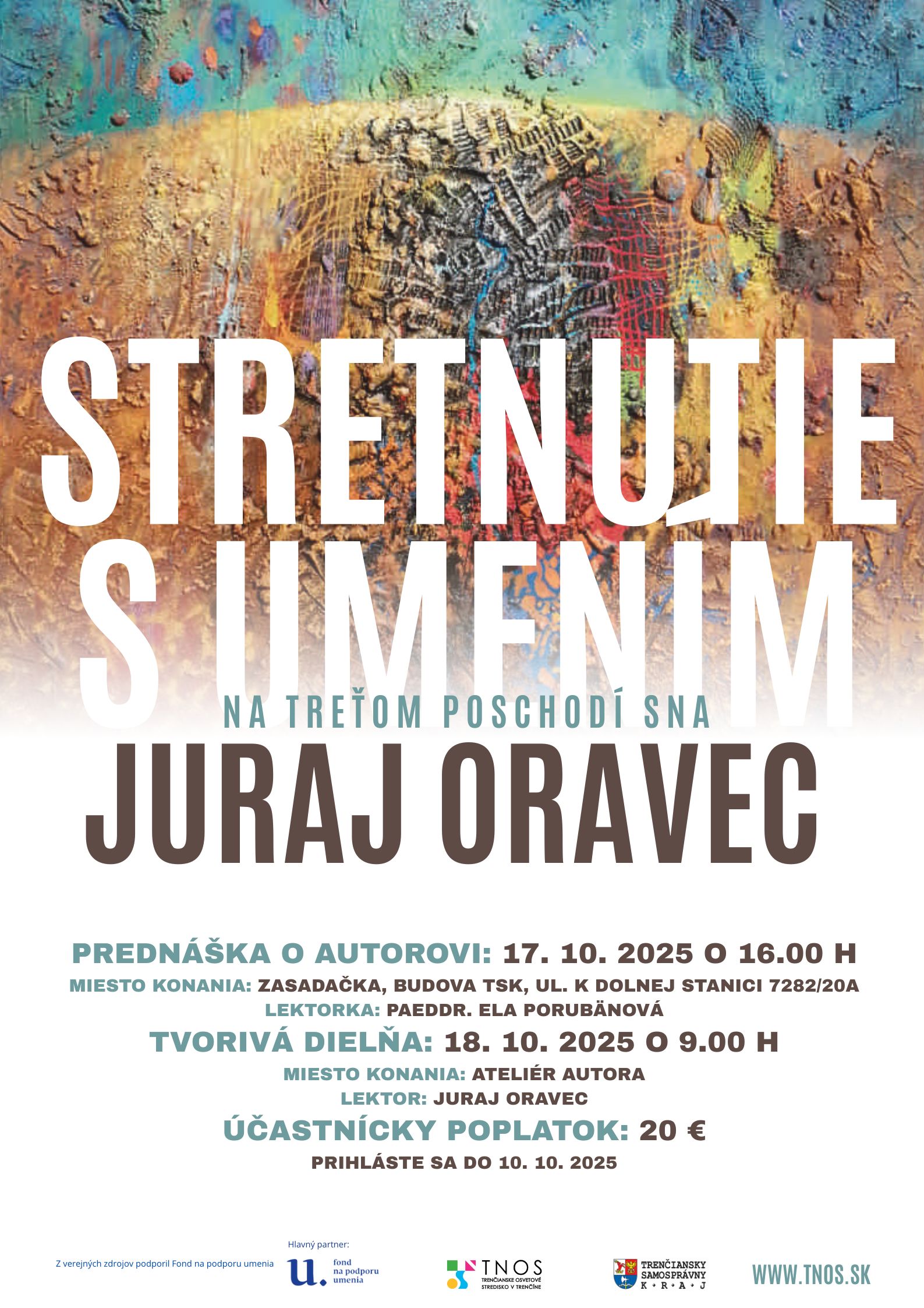 Trenčianske osvetové stredisko v Trenčíne Vás pozýva na tretie podujatie v rámci cyklu STRETNUTIE S UMENÍM, ktoré bude venované práci a tvorbe výrazného predstaviteľa súčasnej slovenskej výtvarnej scény – Trenčana Juraja Oravca.
