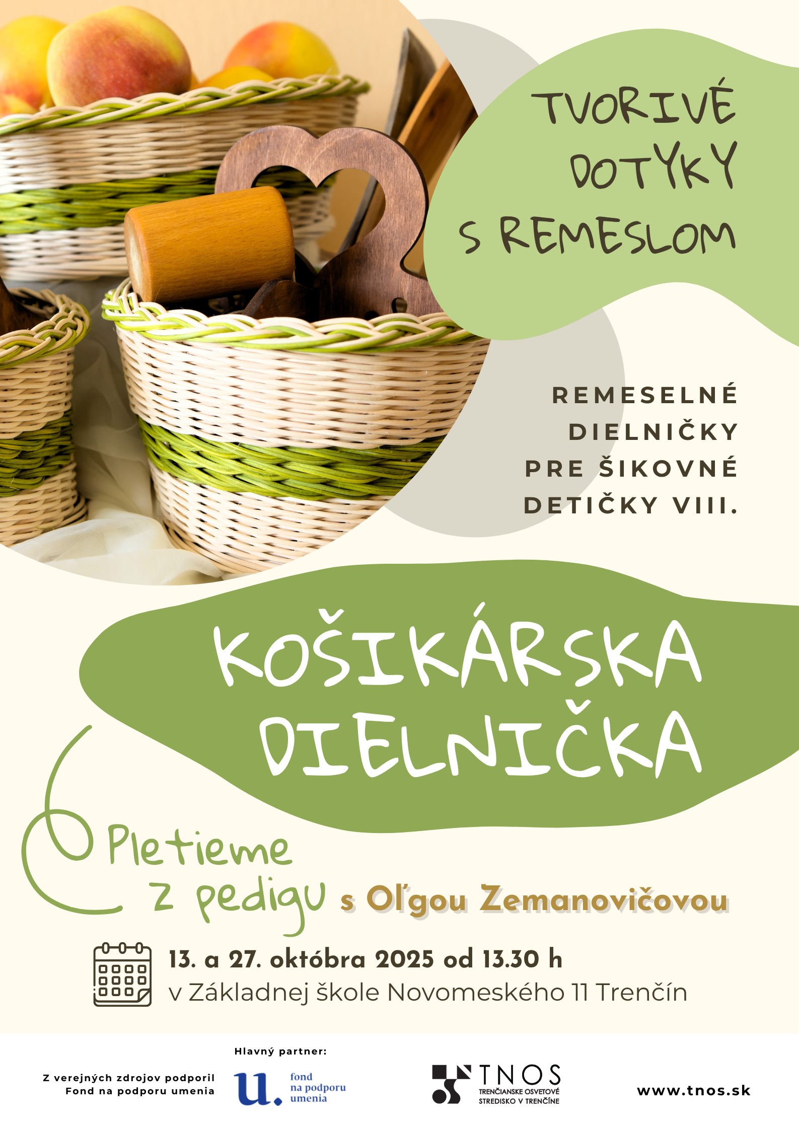 Trenčianske osvetové stredisko v Trenčíne realizuje už ôsmy ročník obľúbeného cyklu remeselných tvorivých dielničiek pre deti – TVORIVÉ DOTYKY S REMESLOM s cieľom poskytnúť priestor na vzdelávanie v oblasti ľudového umenia.