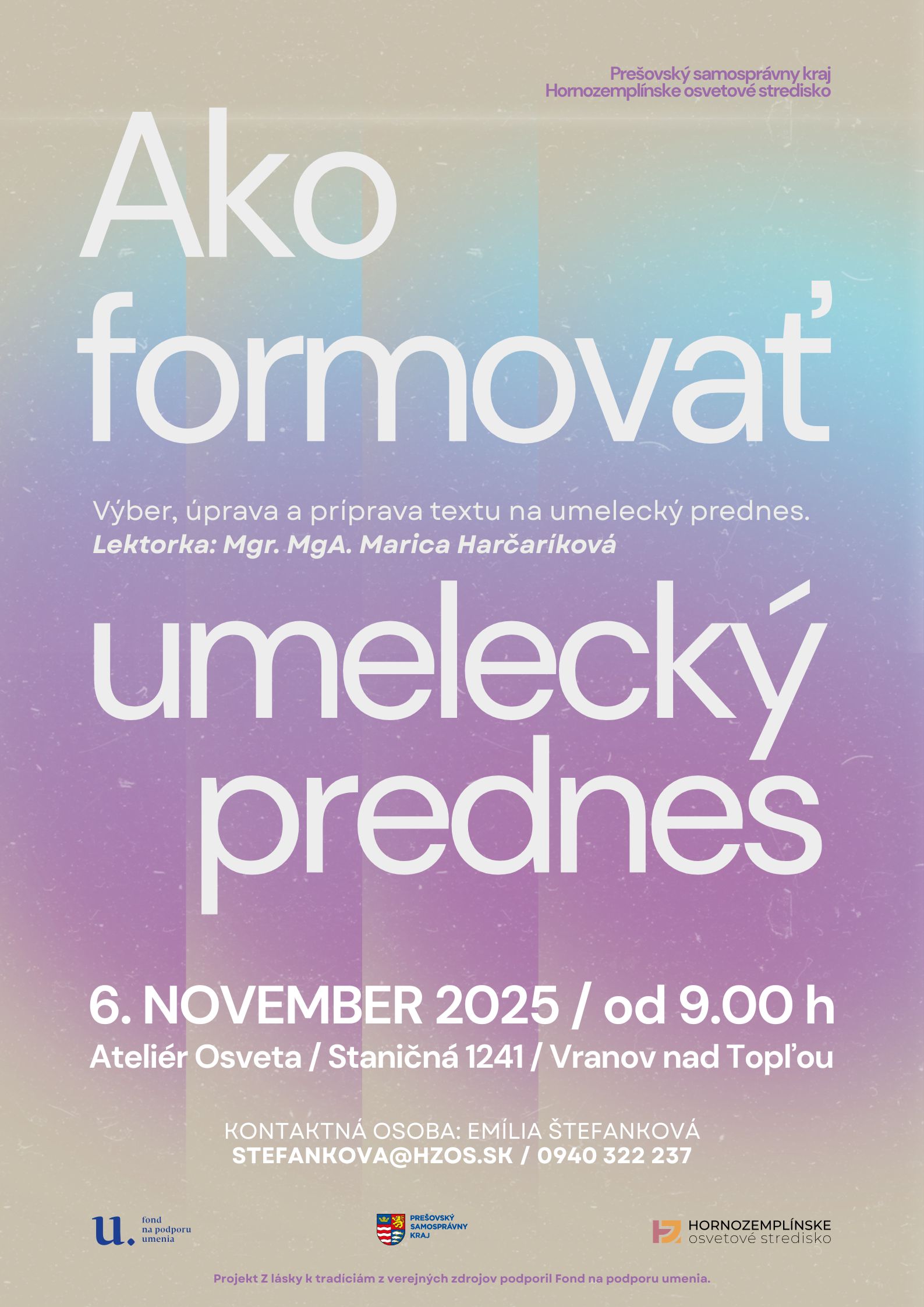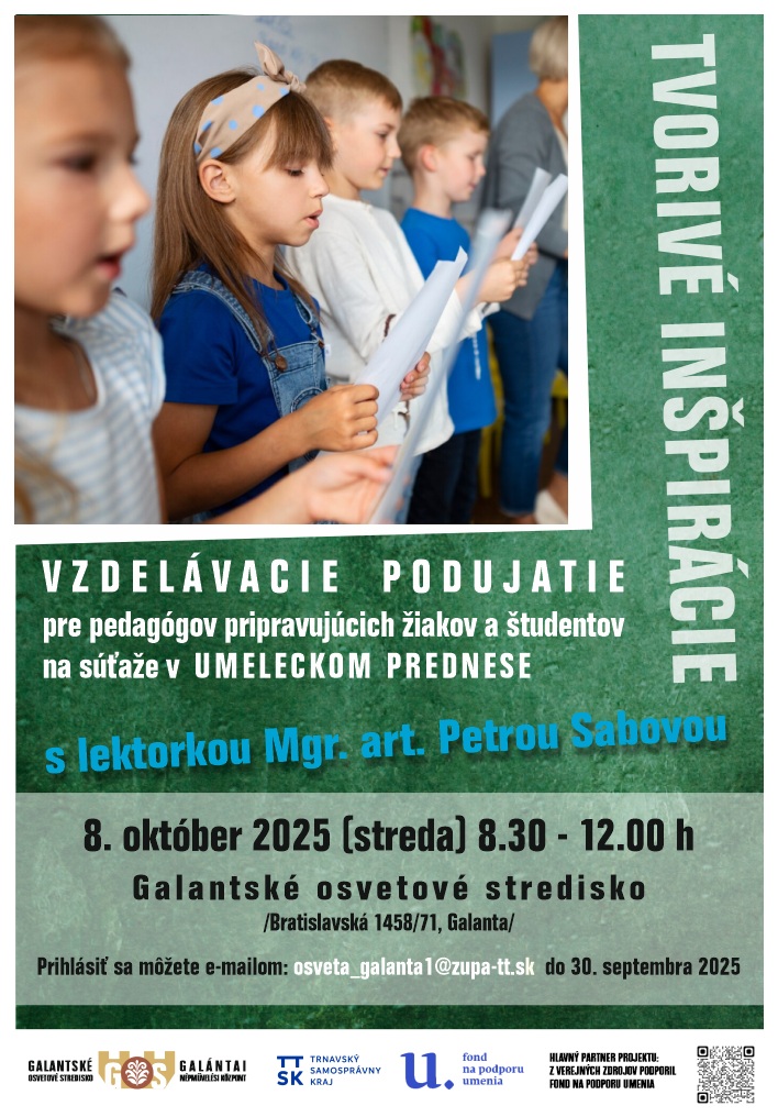 Pre záujemcov o hovorené slovo pripravilo Galantské osvetové stredisko dňa 8. októbra 2025 zaujímavé edukačné podujatie, konkrétne z oblasti umeleckého prednesu poézie a prózy. Vzdelávanie sa uskutoční v priestoroch Galantského osvetového strediska a napomáha ako motivačný prvok pre účastníkov, aby napredovali vo svojom umeleckom vzostupe. Podujatie z verejných zdrojov podporil Fond na podporu umenia, ktorý je aj hlavným partnerom podujatia.