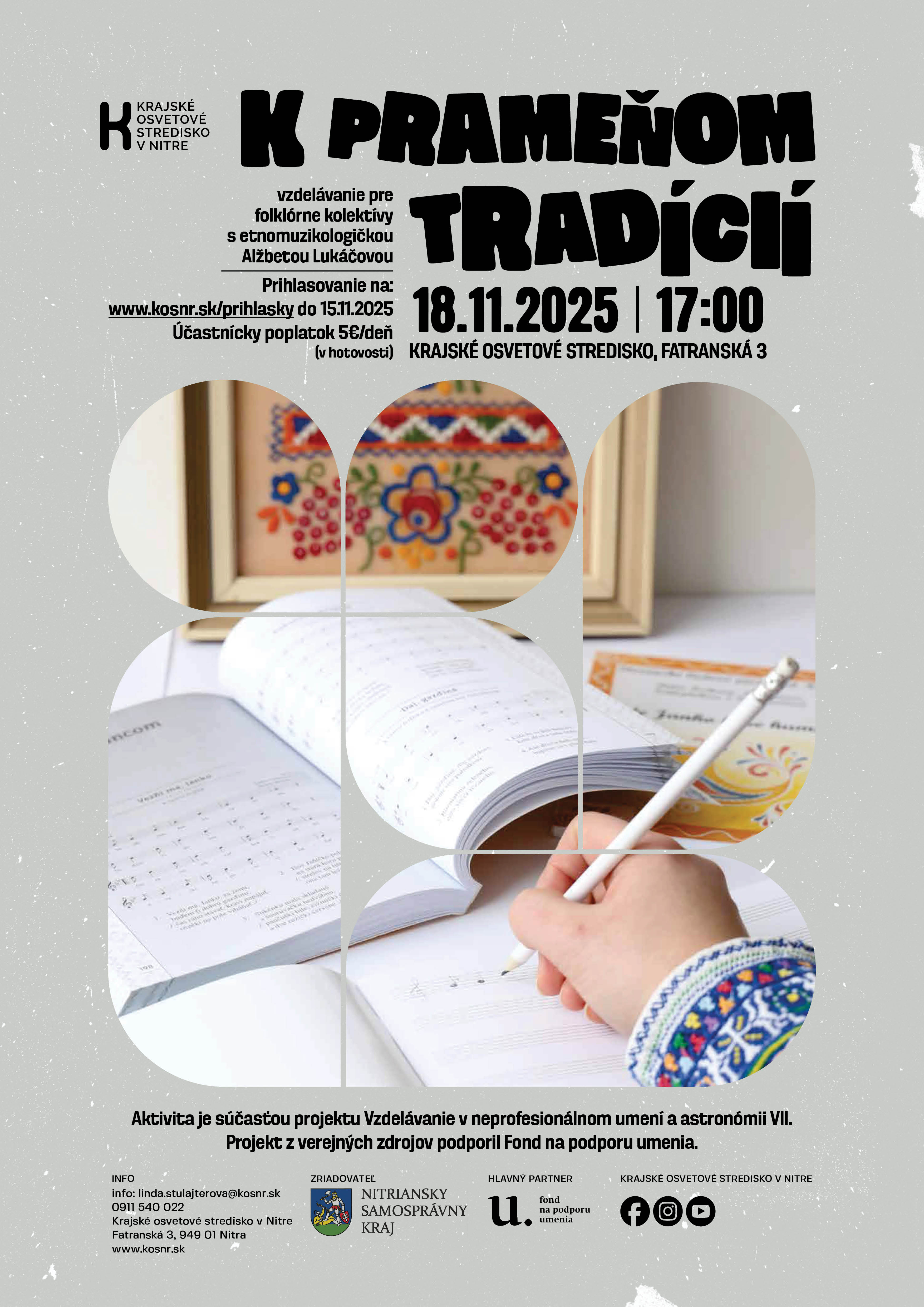 Krajské osvetové stredisko v Nitre pozýva vedúcich a členov na vzdelávanie pre folklórne kolektívy s etnomuzikologičkou Alžbetou Lukáčovou 18.11.2025 od 17:00 v priestoroch Krajského osvetového strediska na Fatranskej č. 3. Vzdelávanie je určené pre všetkých, ktorí majú záujem dozvedieť sa viac ako pracovať s pramenným materiálom a ako ho analyzovať. Veľmi zaujímavou časťou bude praktická časť zameraná na interpretáciu vybraného repertoáru z regiónu Ponitrie.