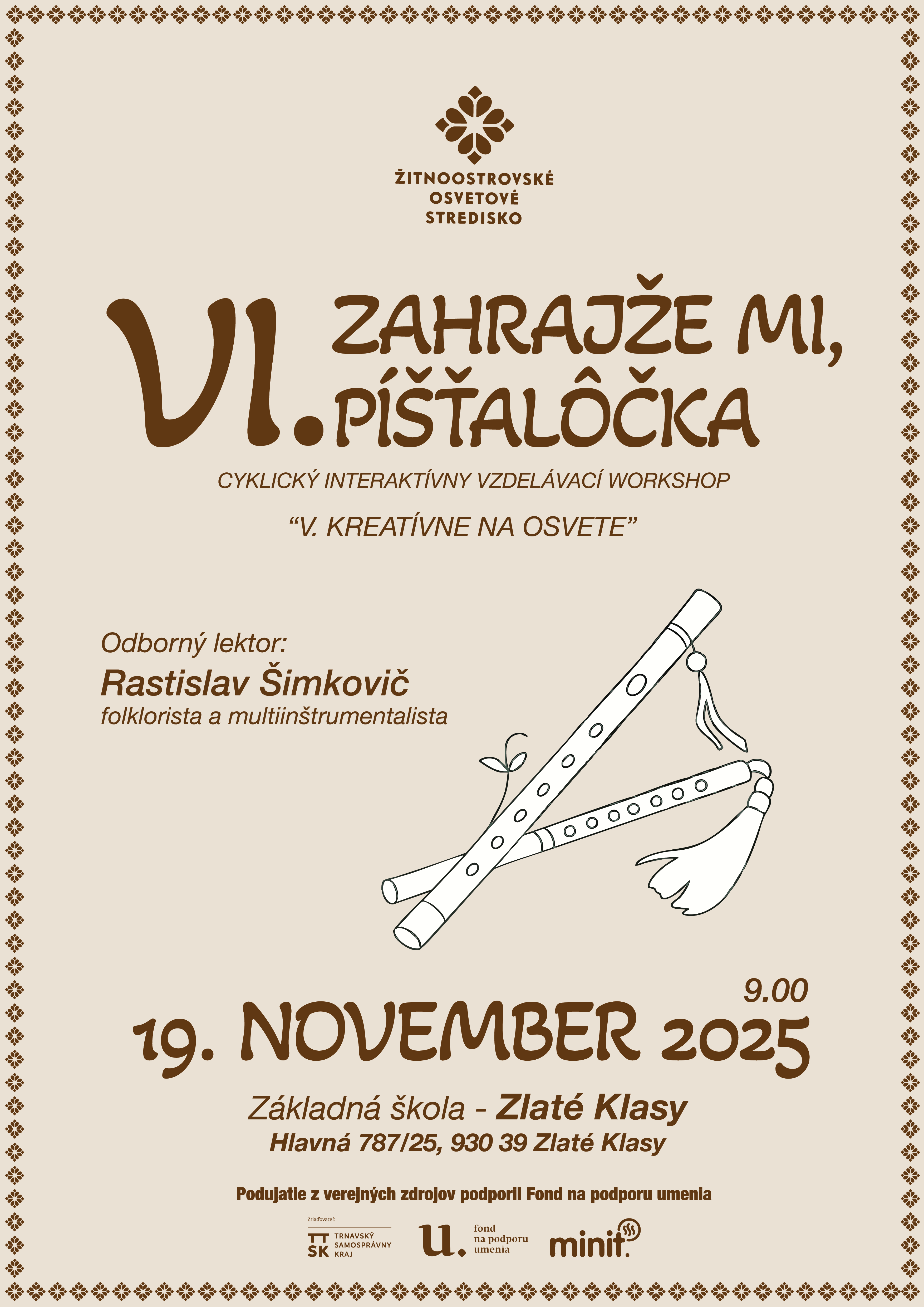 Workshop zameraný na výučbu herných štýlov tradičnej ľudovej hudby pre husle, violu a kontrabas pod vedením Radoslava Kertisa a Michala Zelinku. Účastníci sa oboznámia s autentickými hernými technikami a spôsobom interpretácie ľudovej hudby. Podujatie sa uskutoční 9. novembra 2025 o 10.00 h v Ateliéri Osveta vo Vranove nad Topľou.
