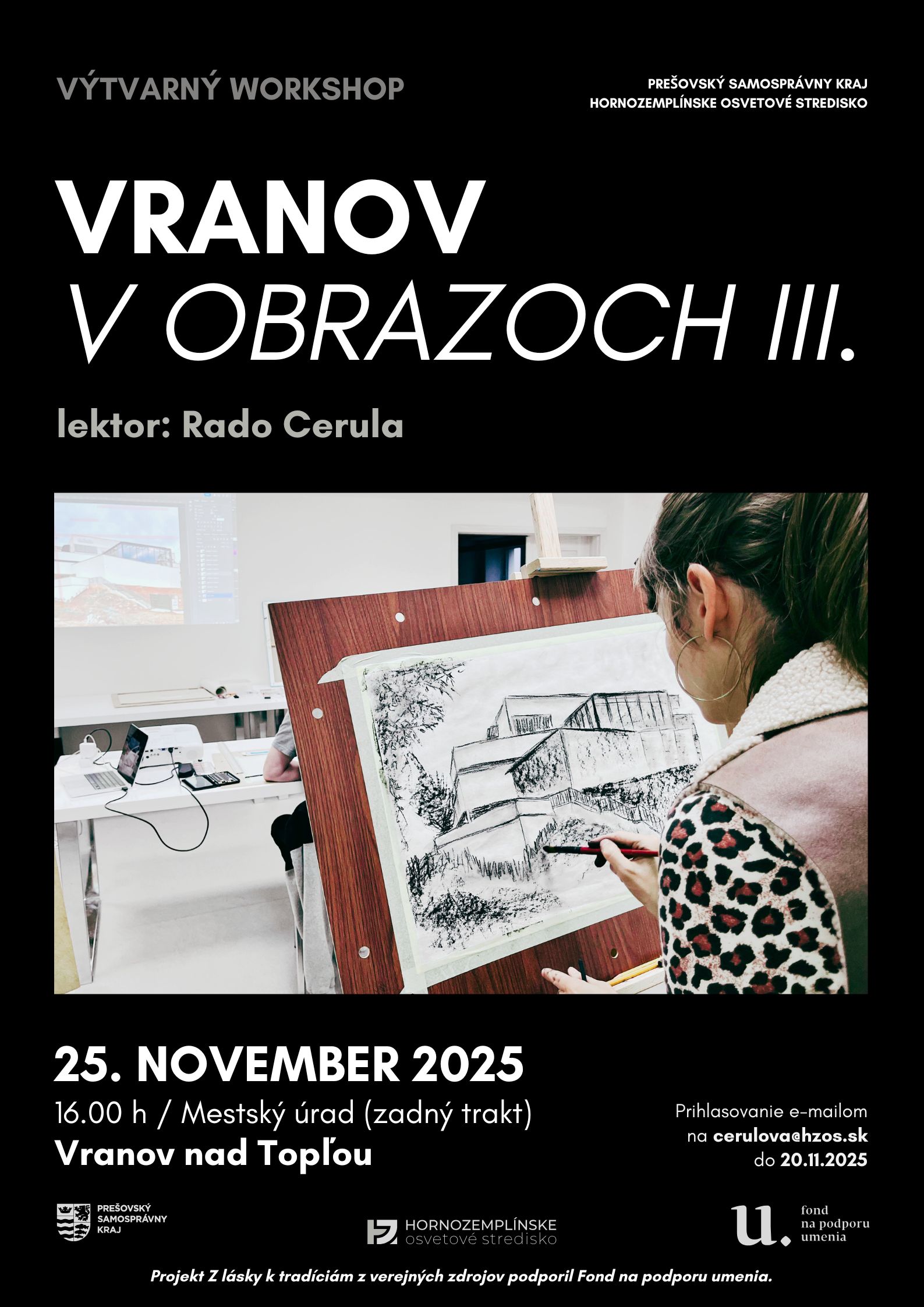 Výtvarný workshop Vranov v obrazoch II. pod vedením Rada Cerulu prinesie možnosť zachytiť mesto prostredníctvom vlastnej tvorby. Účastníci sa naučia vnímať architektúru i atmosféru Vranova a preniesť ich do výtvarnej podoby. Podujatie sa uskutoční 28. októbra 2025 o 16:00 h v zadnom trakte Mestského úradu vo Vranove nad Topľou.