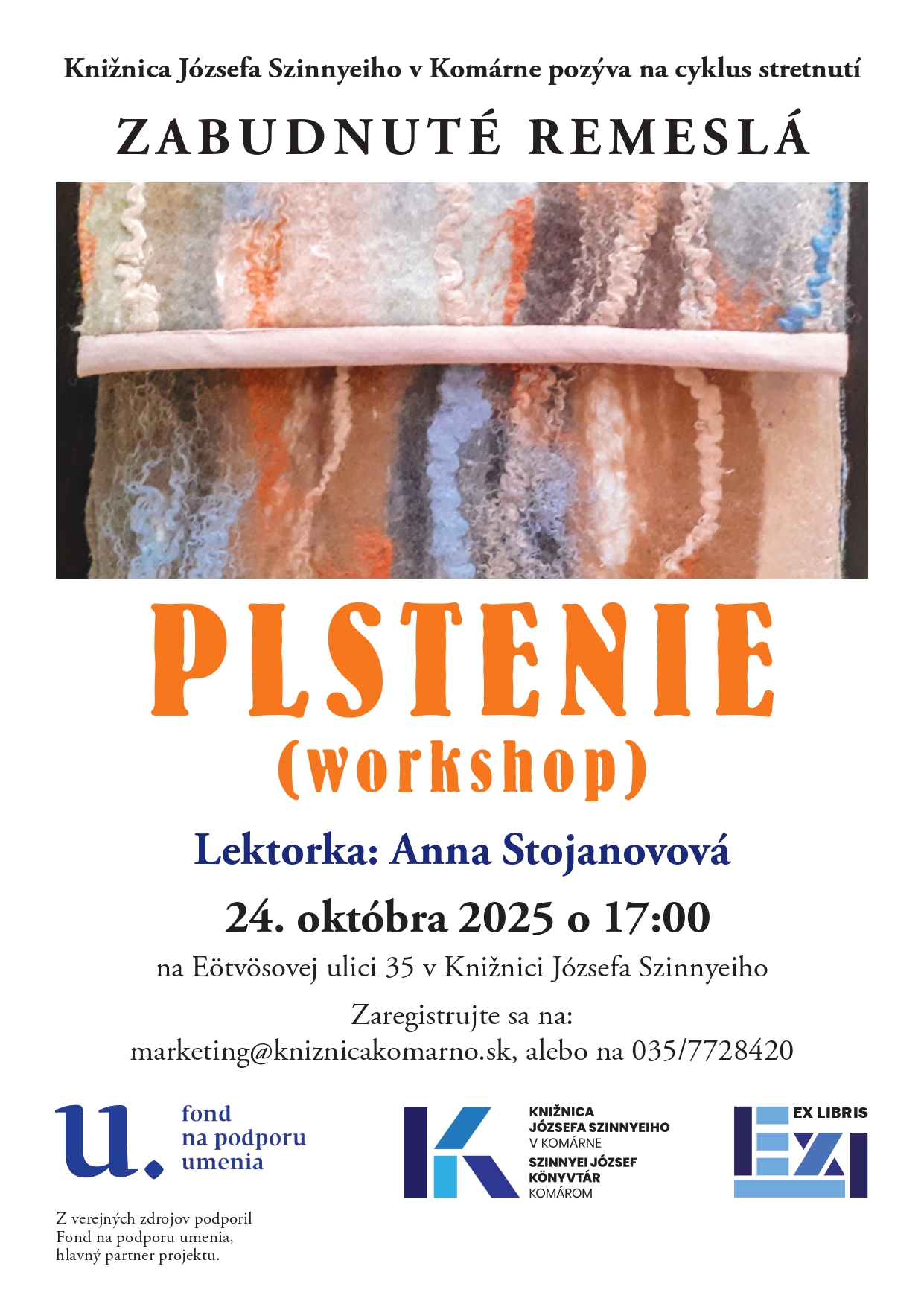 Plstenie je starobylá textilná technika, pri ktorej sa z ovčej vlny vyrába pevná látka bez tkania či pletenia. Vlákna sa spájajú pôsobením tepla, vlhkosti a tlaku – ručne, pomocou vody a mydla (mokré plstenie) alebo ihlou (suché plstenie). Technikou plstenia nás oboznámi lektorka Anna Stojanová.